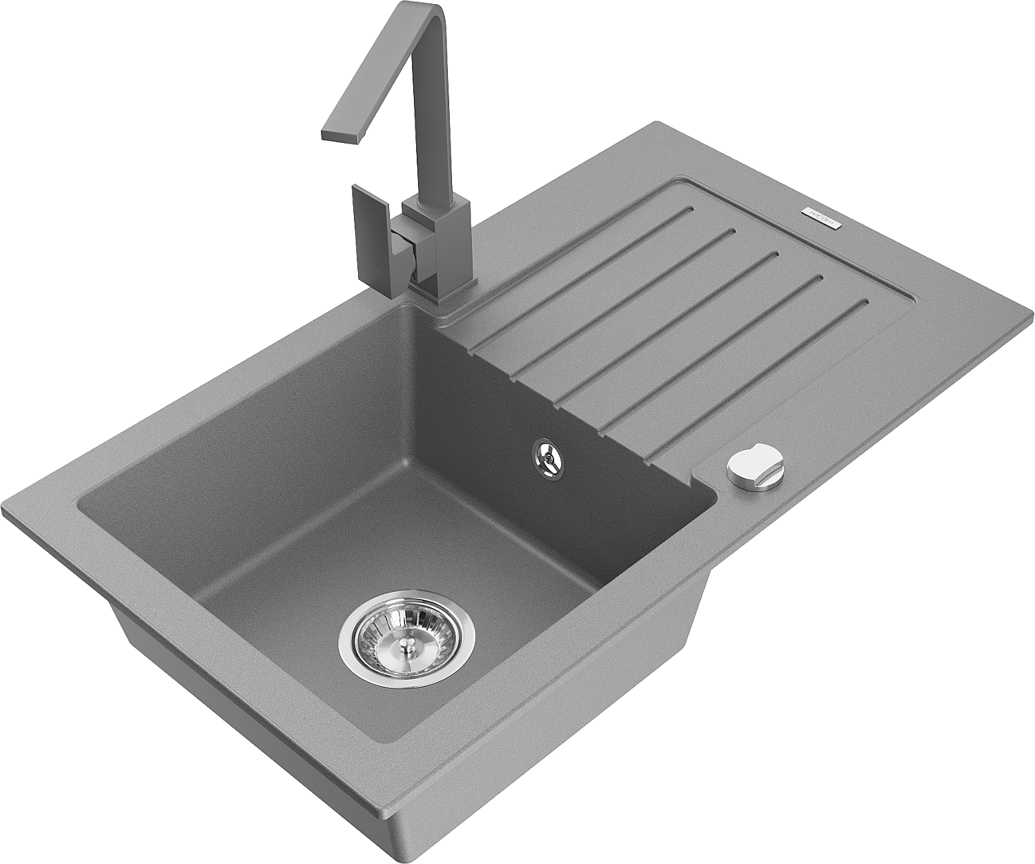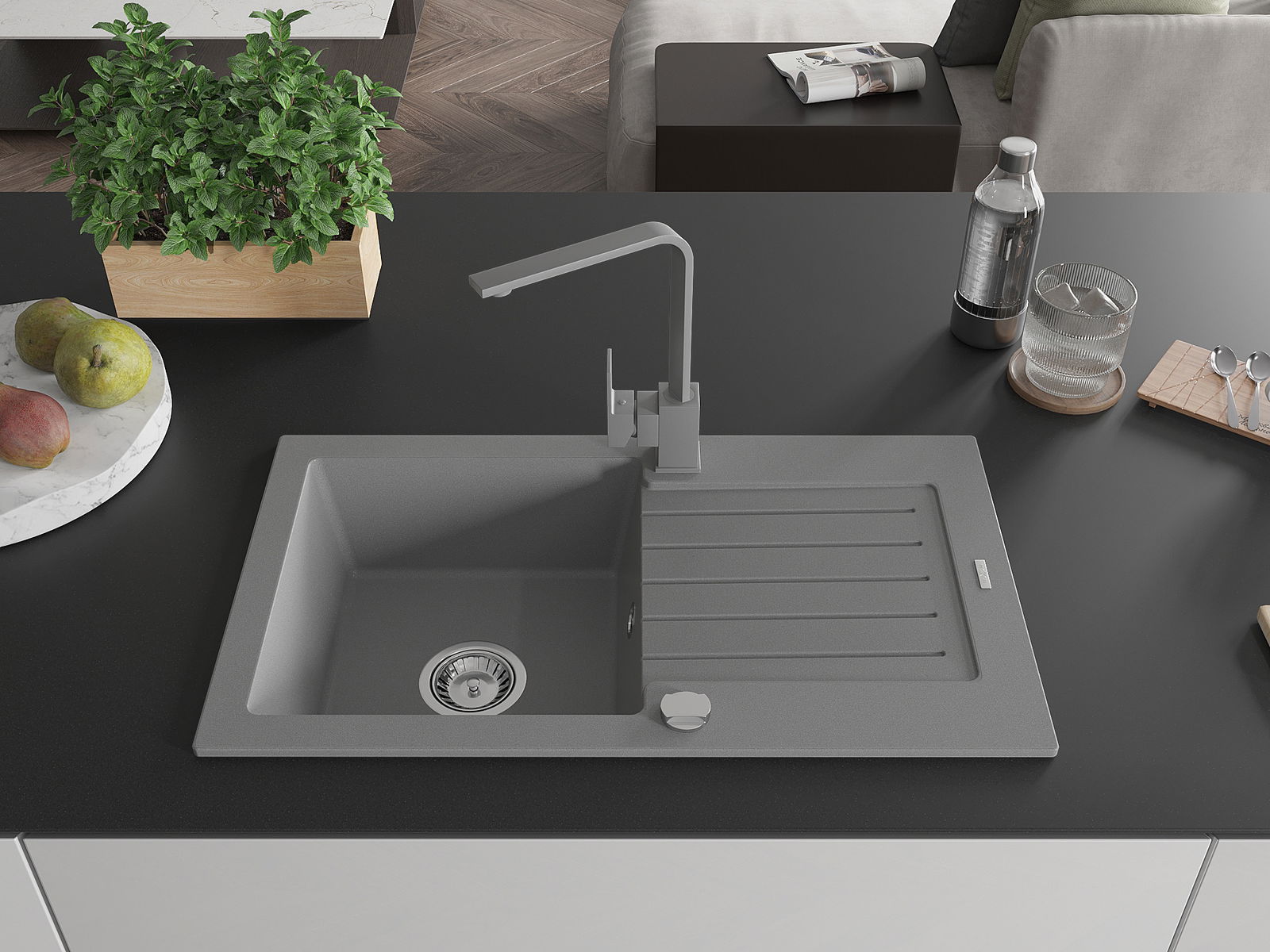 Mexen Pablo žulový drezu 1-komorový s odkvapkávačom a kuchynskou batériou Rita, sivý - 6510-71-670300-71