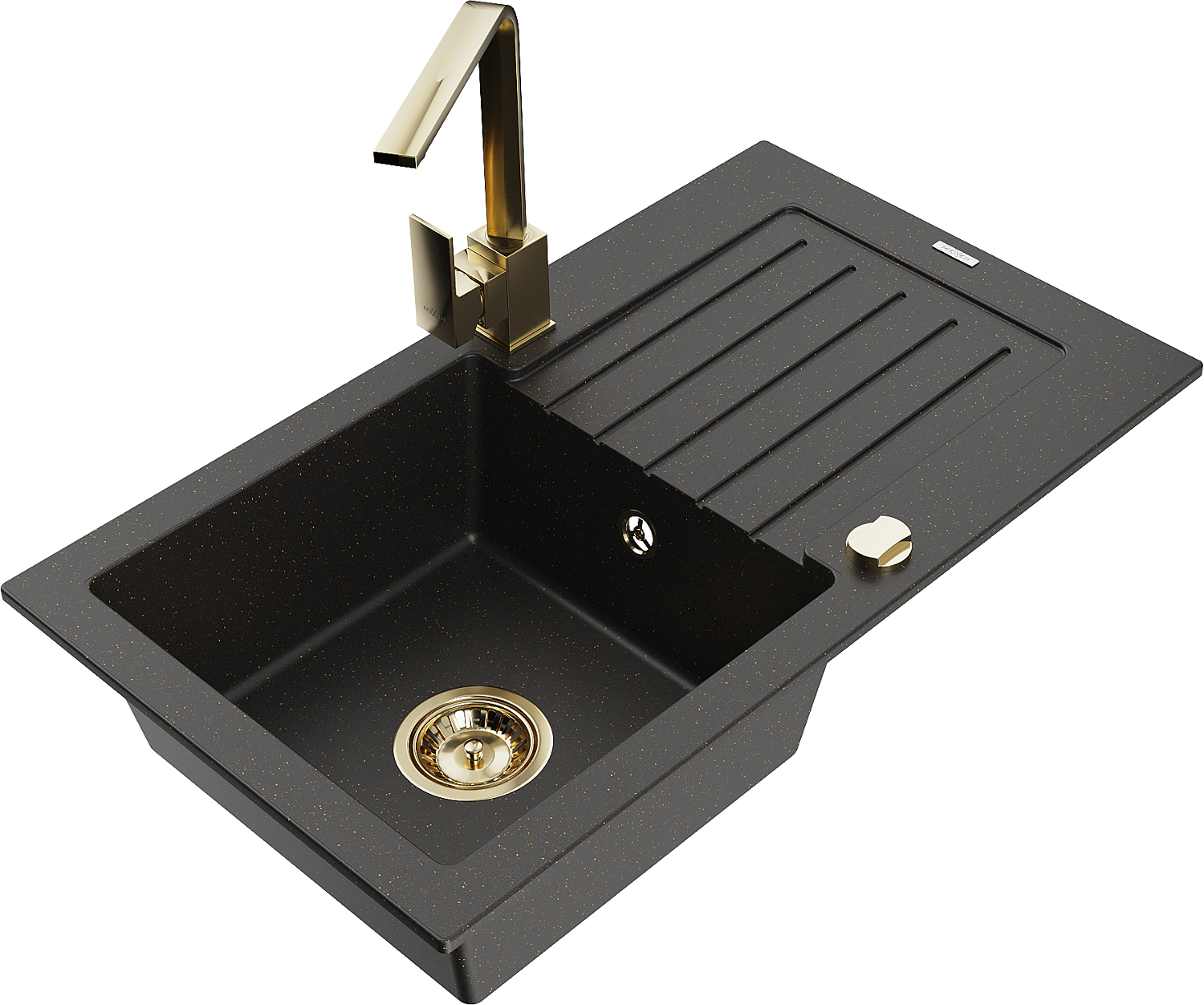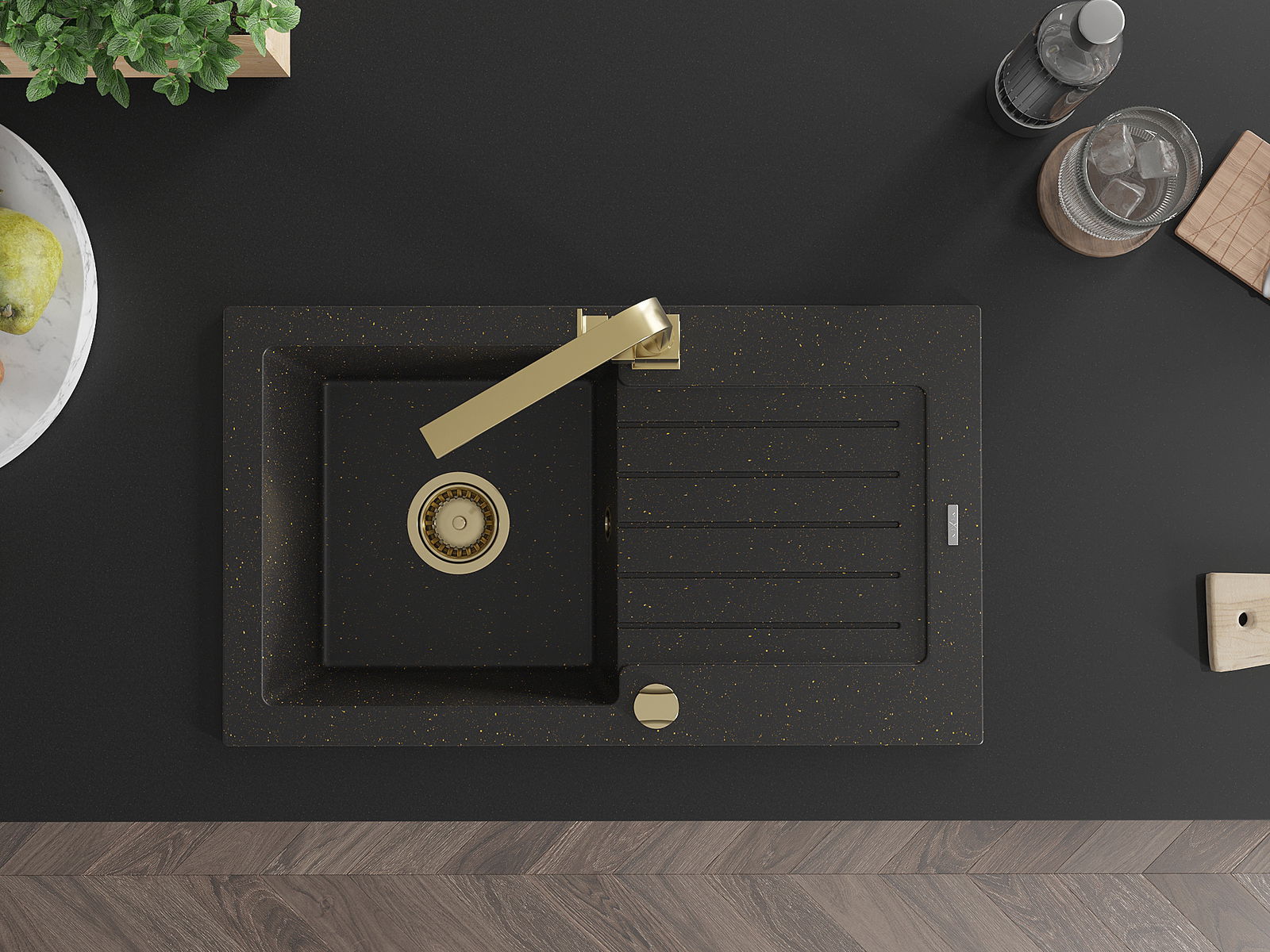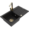 Mexen Pablo žulový jednodrez s odkvapkávačom a kuchynskou batériou Rita, čierny/zlatý metalický- 6510-75-670300-50