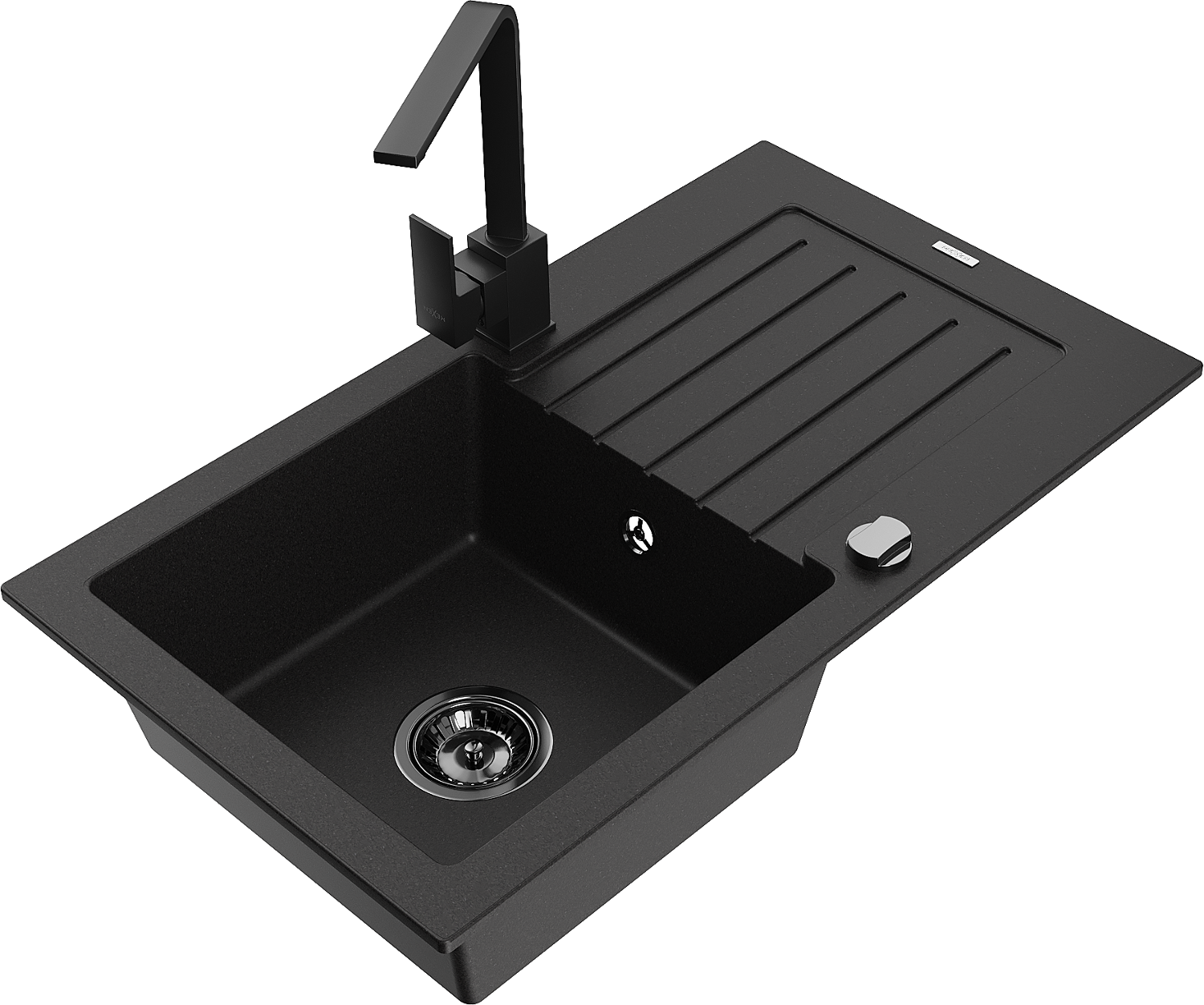 Mexen Pablo granitový drez s 1 komorou, odkladacou plochou a kuchynskou batériou Rita, čierny - 6510-77-670300-70-B