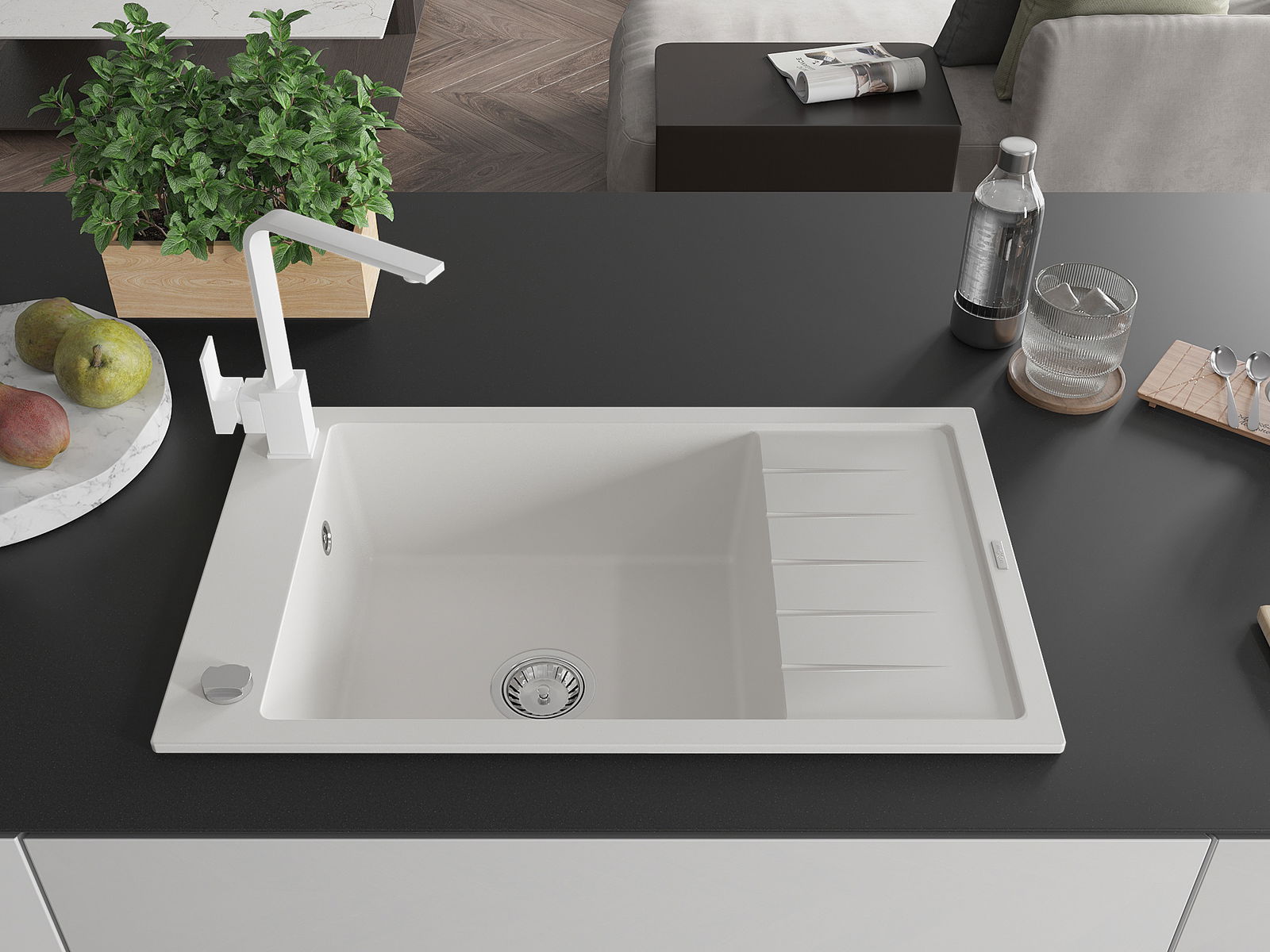 Mexen Elias granitový kuchynský drez s 1-komorou, odkvapkávacou plochou a kuchynskou batériou Rita, biela - 6511-20-670300-20