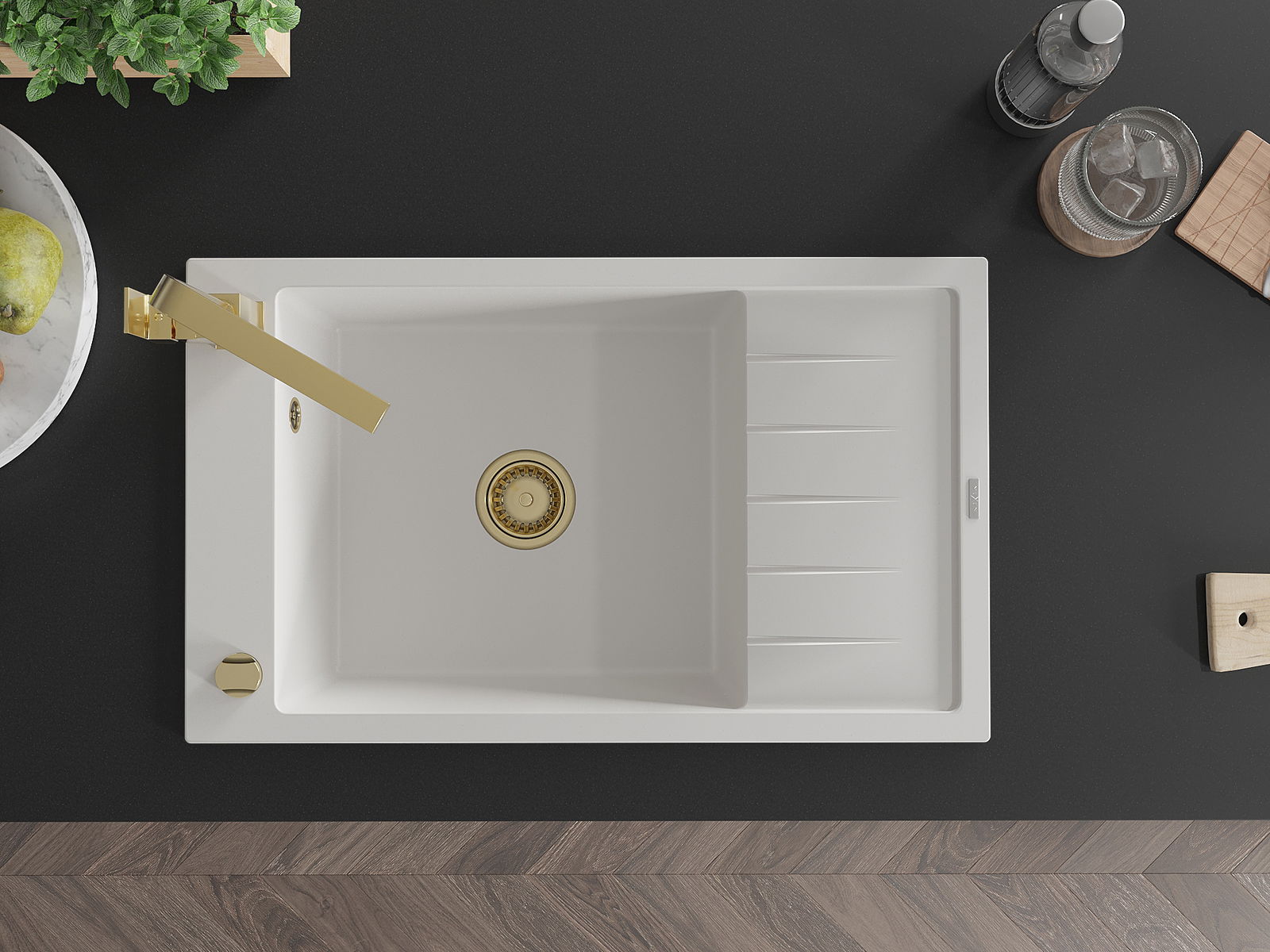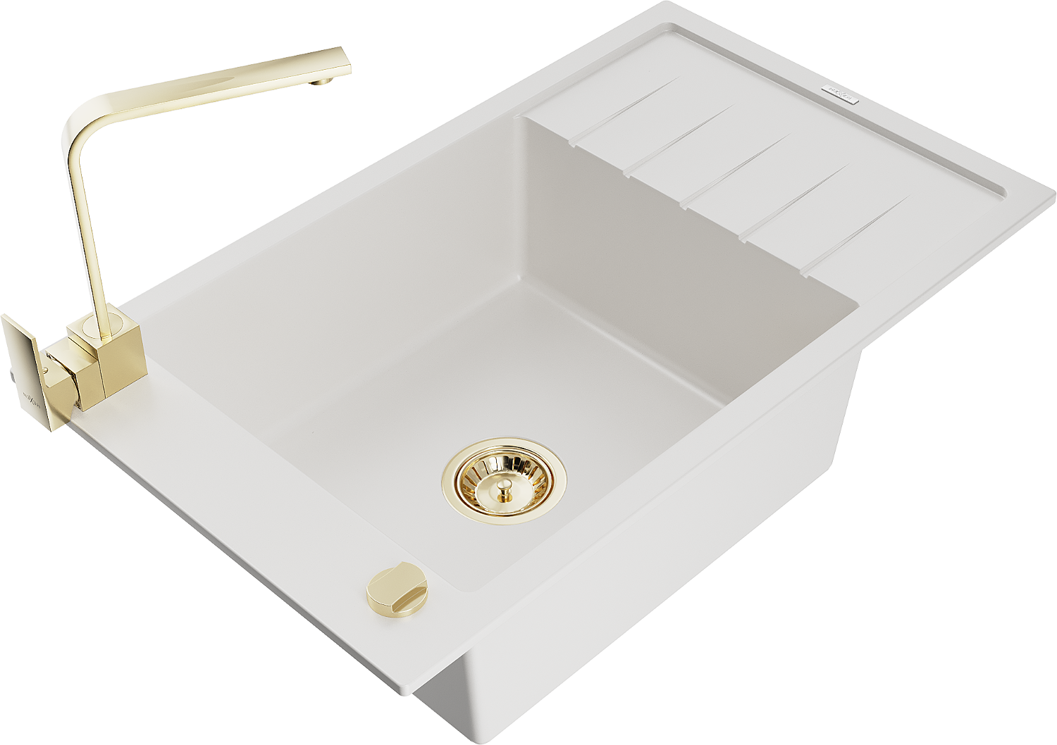 Mexen Elias jednokomorový žulový drez s odkvapkávačom a kuchynskou batériou Rita, biely - 6511-20-670300-50