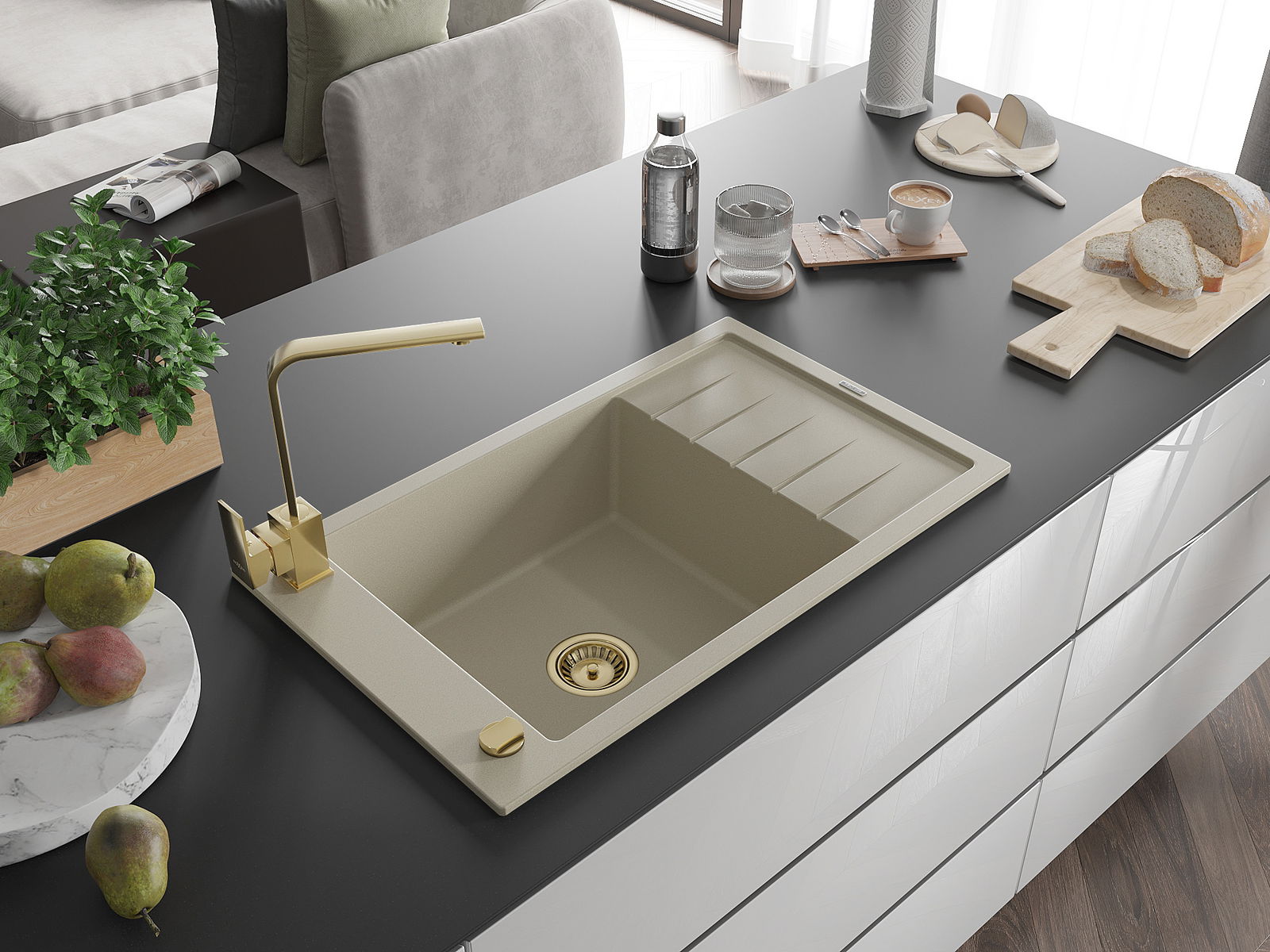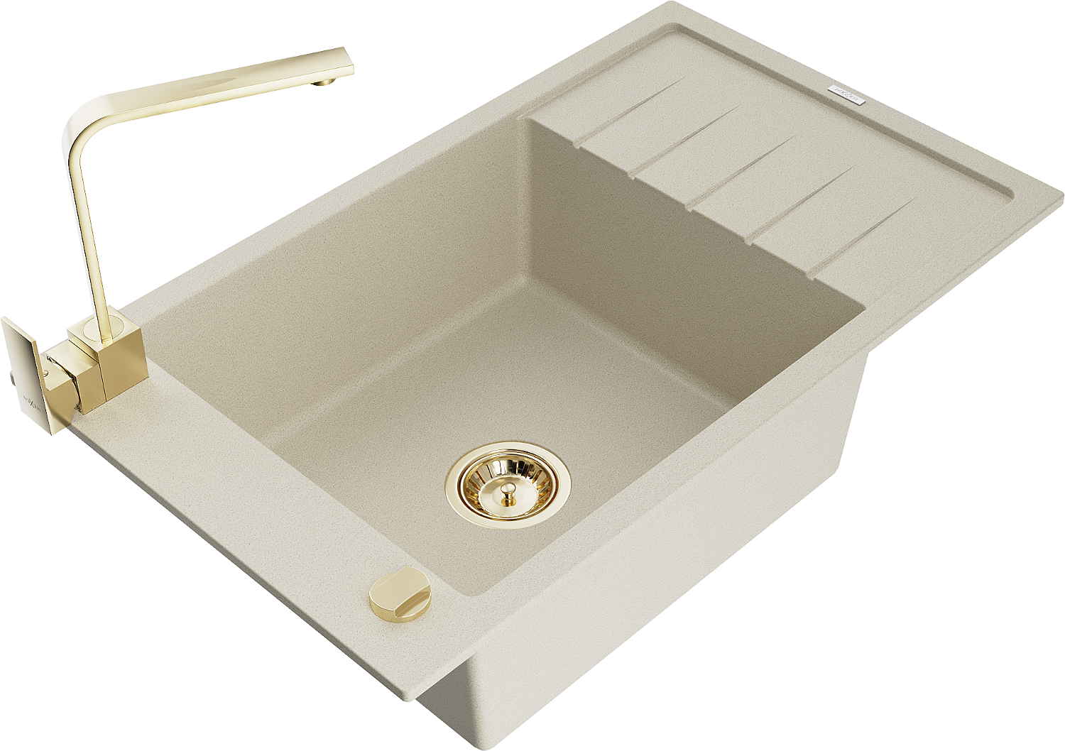 Mexen Elias granitový drez 1-komorový s odkvapkávačom a kuchynskou batériou Rita, béžový - 6511-69-670300-50