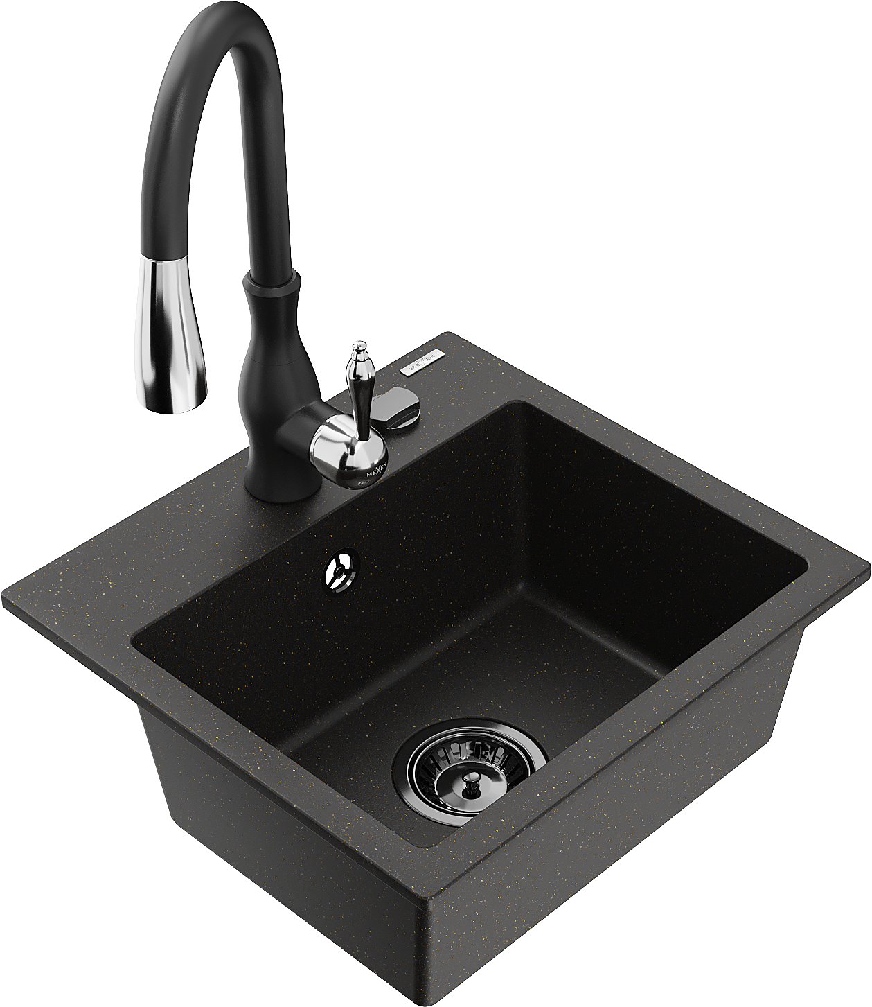 Mexen Milo jednokomorový granitový drez s kuchynskou batériou Savita, čierno/zlatá metalíza- 6505-75-672601-70-B