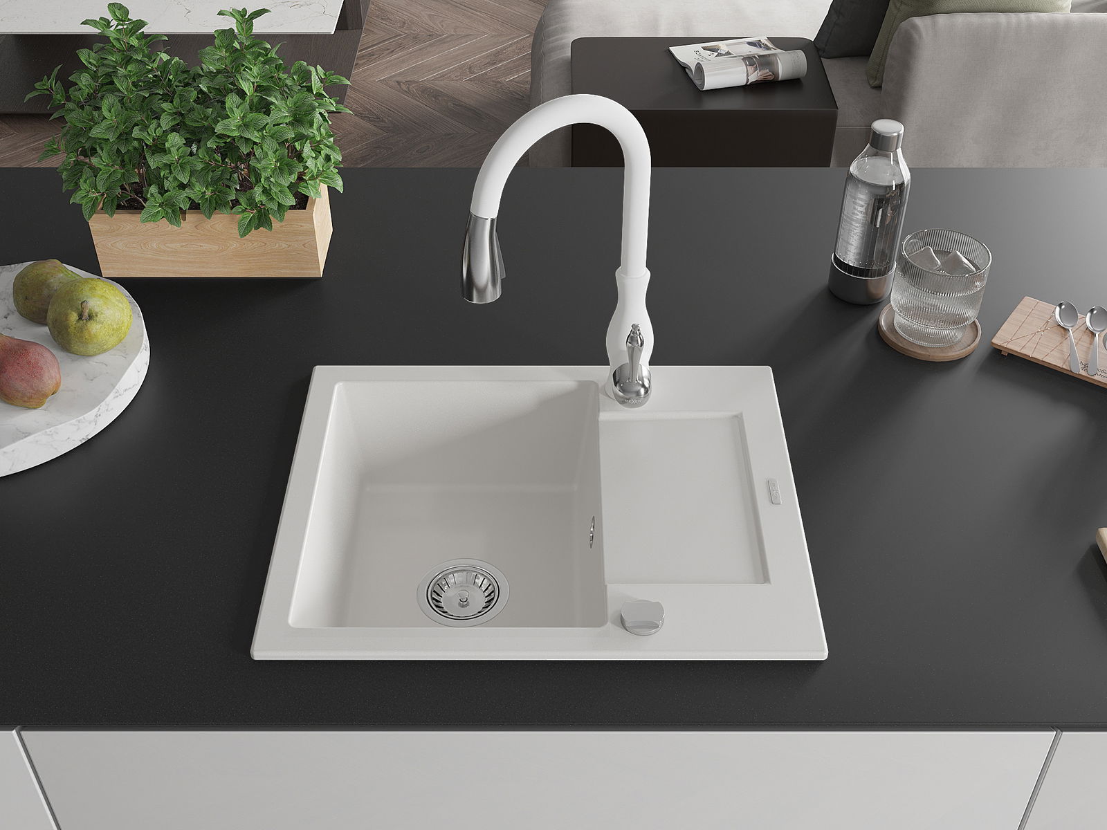 Mexen Enzo žulový drez s 1 komorou, s odkvapkávacou plochou a kuchynskou batériou Savita, biely - 6506-20-672601-20