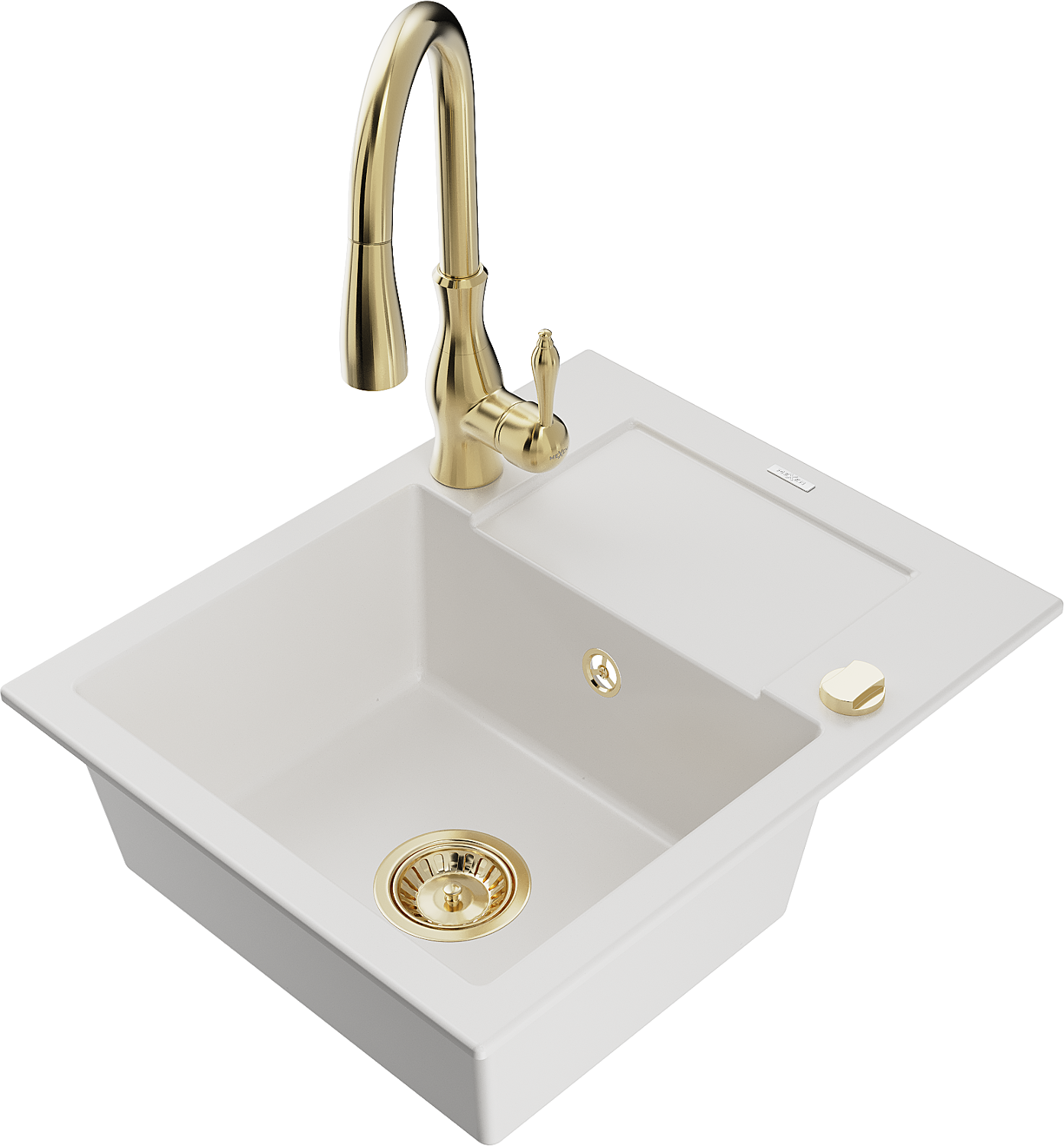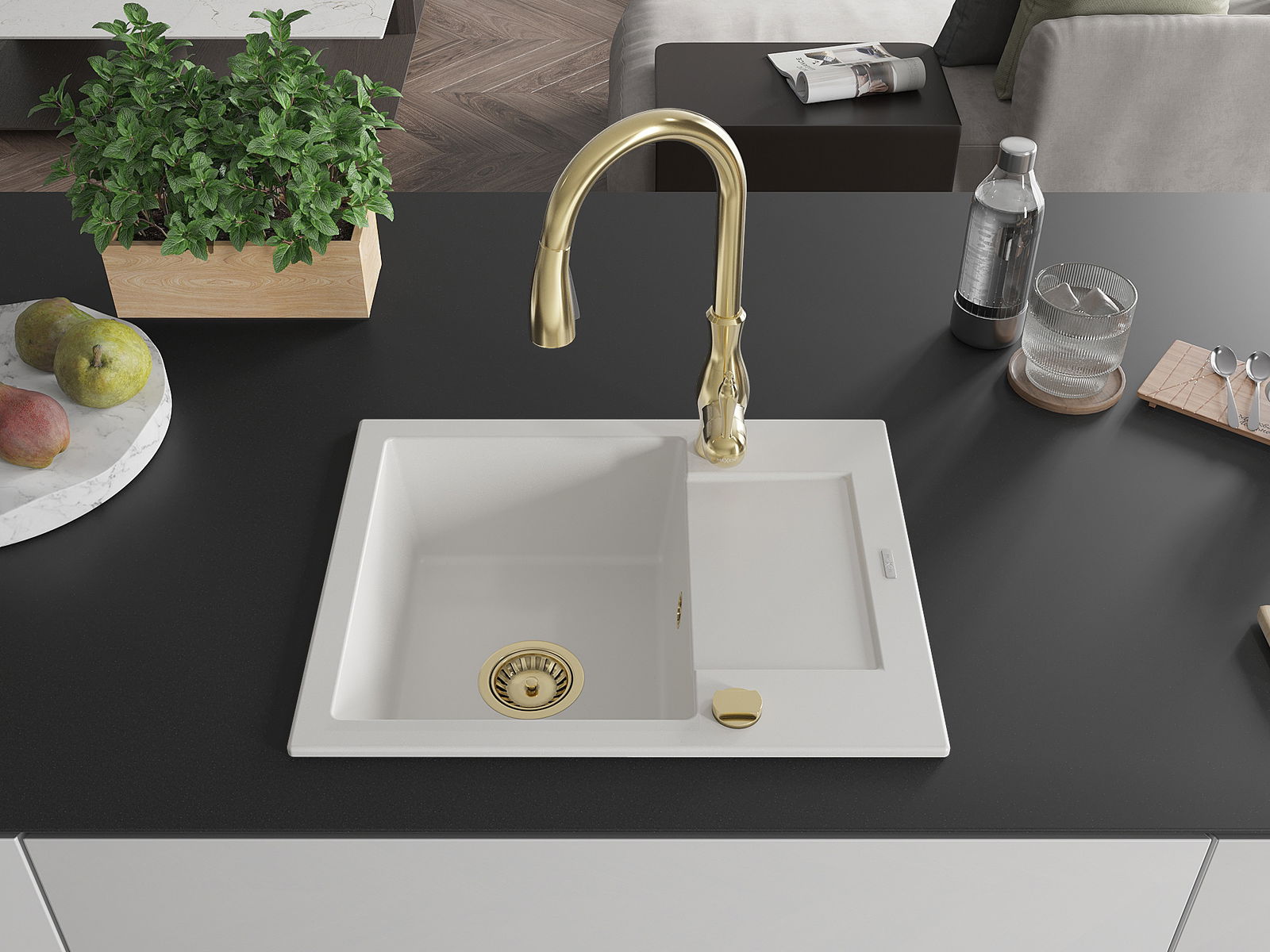 Mexen Enzo žulový 1-komorový drez s odkvapkávačom a kuchynskou batériou Savita, biely - 6506-20-672601-50