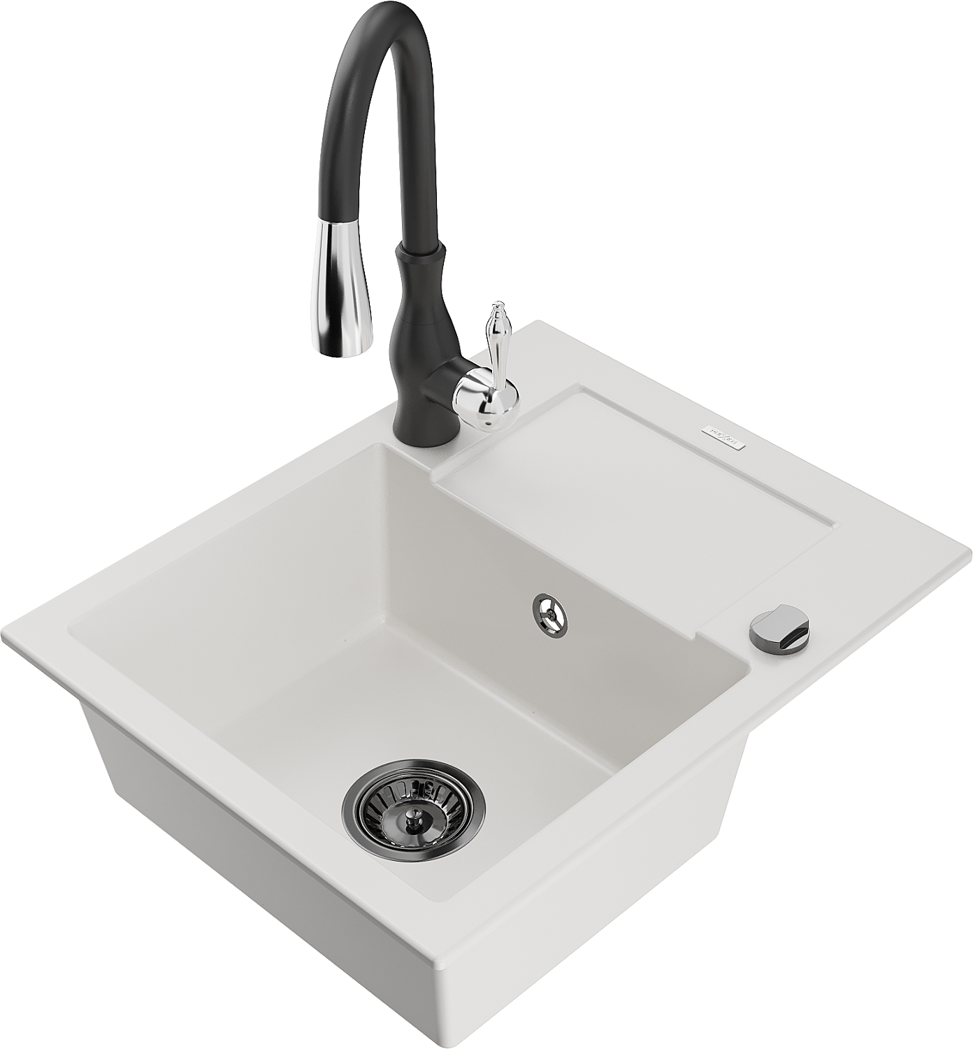 Mexen Enzo žulový drez 1-komorový s odkvapkávačom a kuchynskou batériou Savita, biela - 6506-20-672601-70