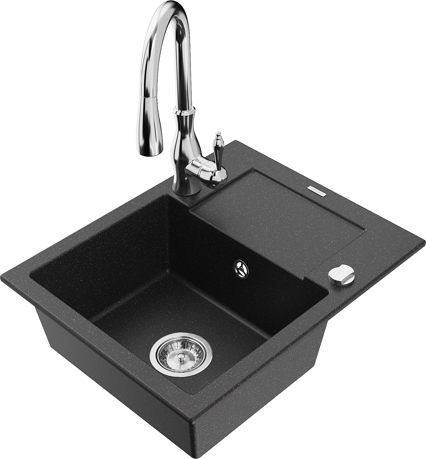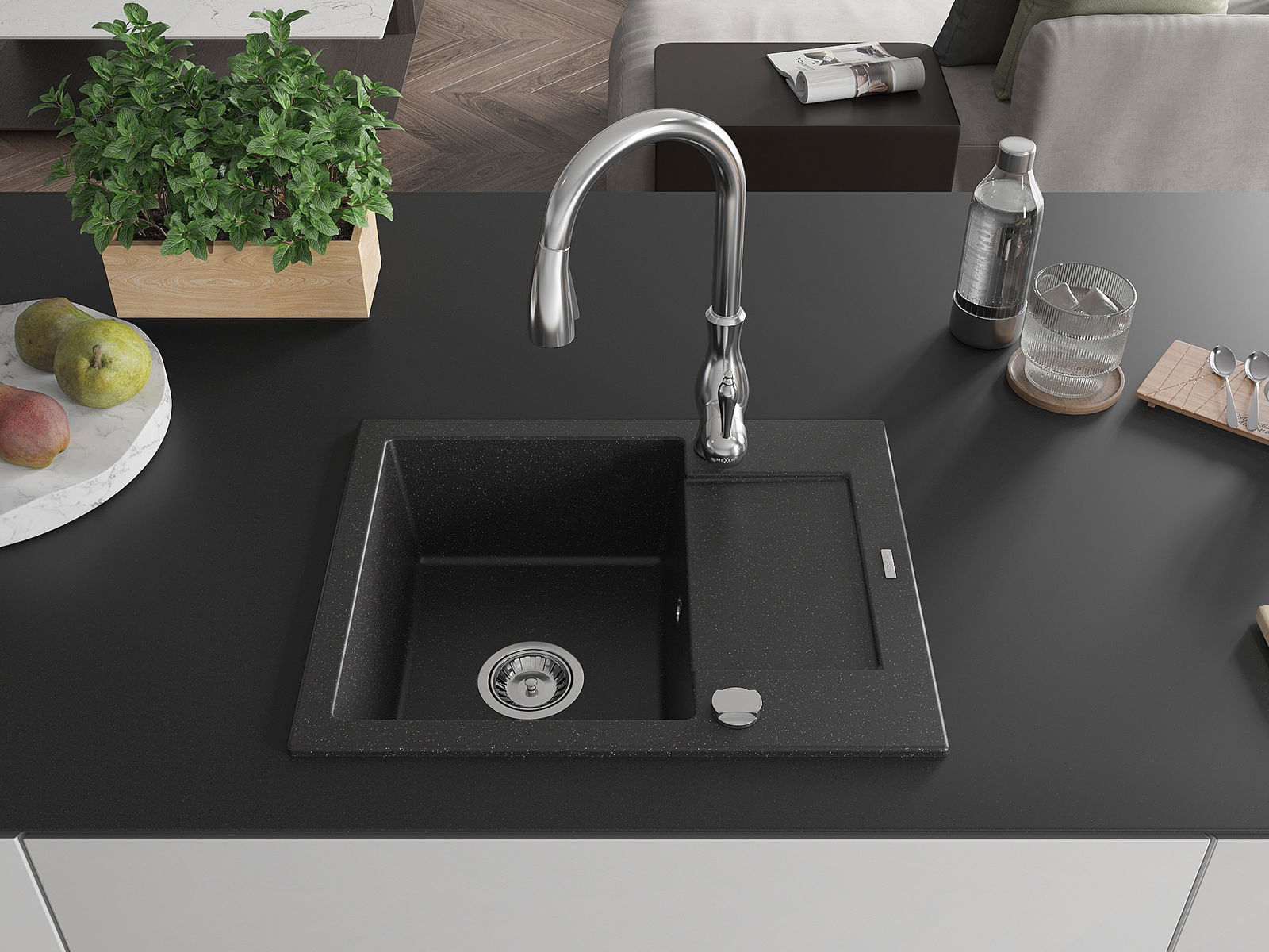 Mexen Enzo žulový drez s 1 komorou a odkvapkávačom a kuchynskou batériou Savita, čierny/strieborný metalík - 6506-73-672601-00