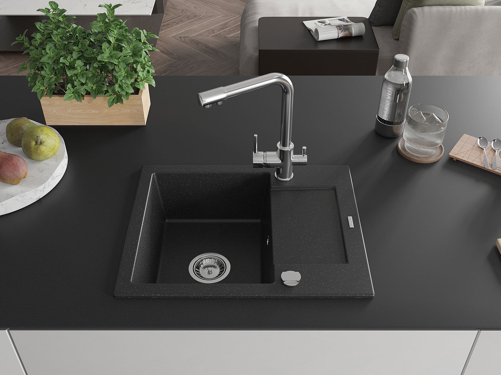 Drez bol vyrobený z vysoko kvalitného granitu. Predstavuje elegantné, ale predovšetkým praktické doplnenie každej kuchyne, nezávisle od jej štýlu. Vysoká kvalita a trvácnosť granitu zaisťujú dlhodobé používanie.