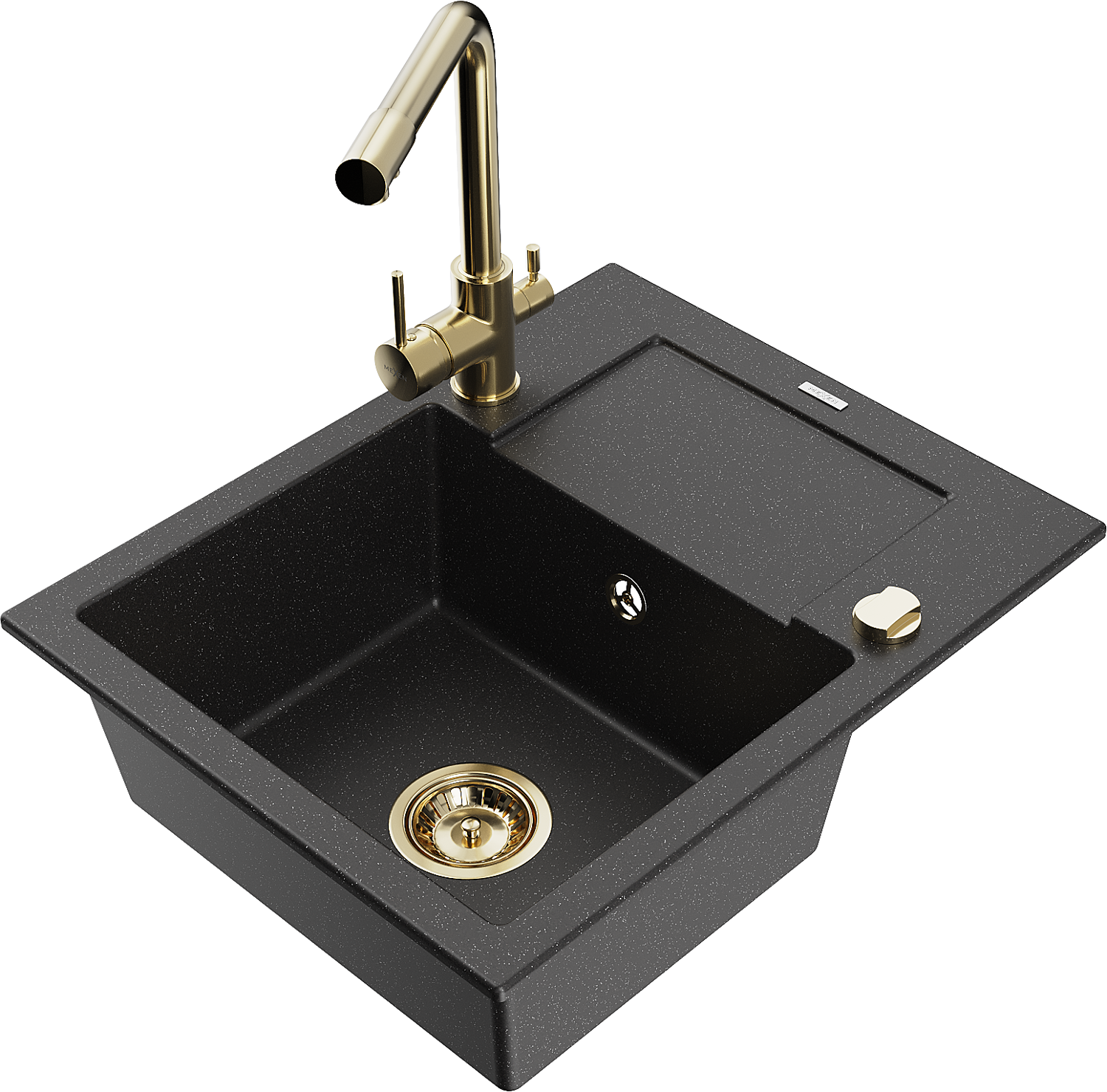 Mexen Enzo granitový drez s 1 komorou, odkvapkávačom a kuchynskou batériou Duero, čierny/strieborný metalíz