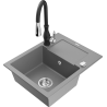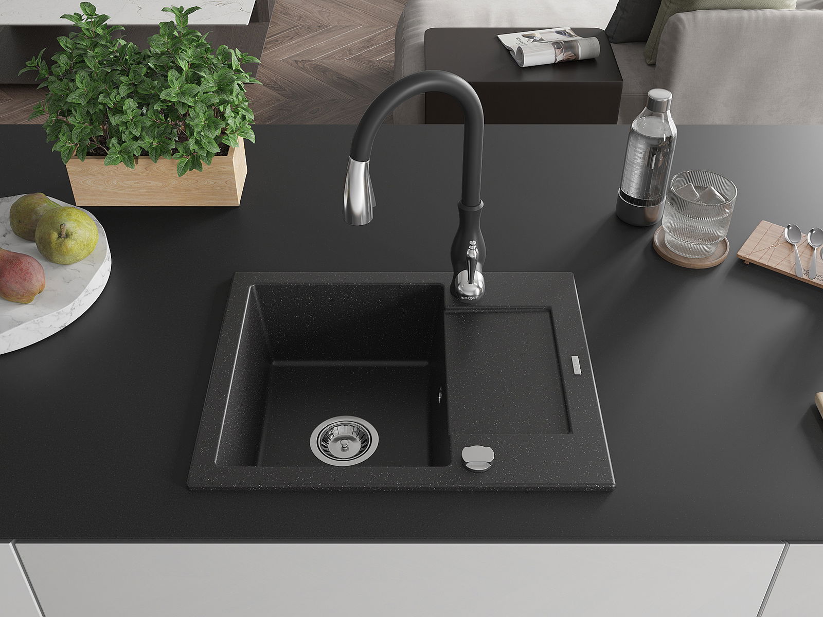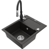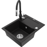 Mexen Enzo jednokomorový žulový drez s odkvapkávacou plochou a kuchynskou batériou Savita, čierny/strieborný metalický