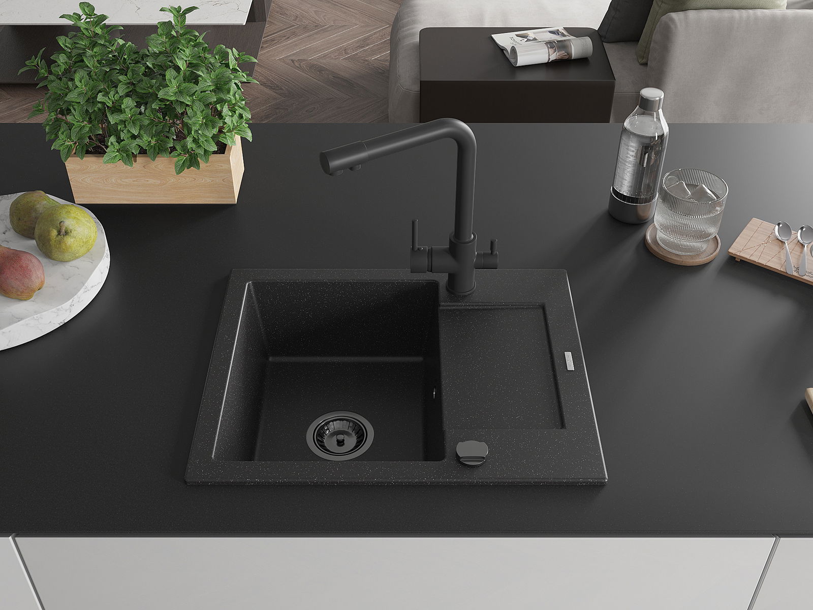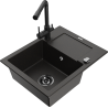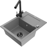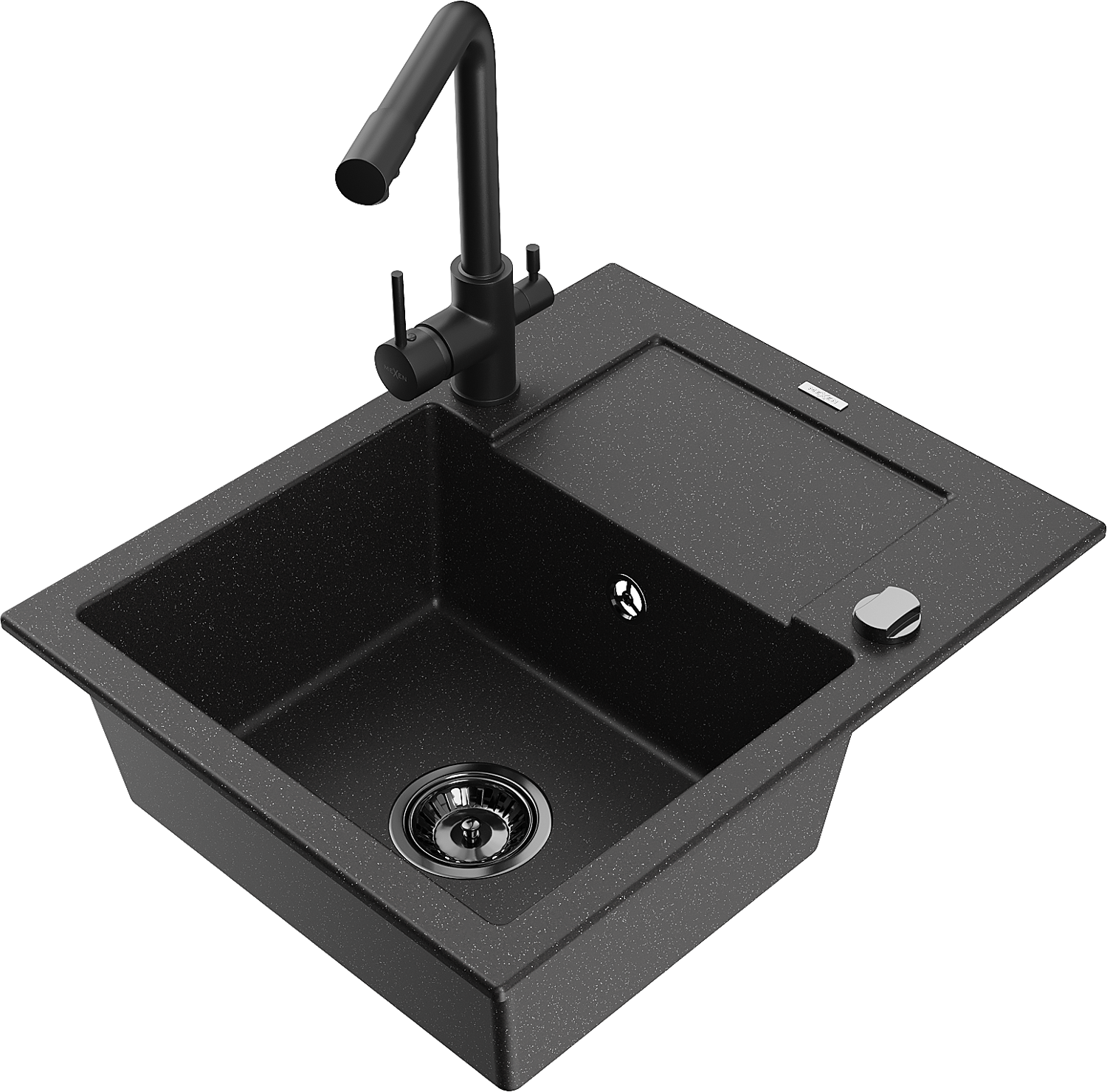 Mexen Enzo granitový drez s 1 komorou s odkvapkávačom a kuchynskou batériou Duero, čierny/strieborný metalický