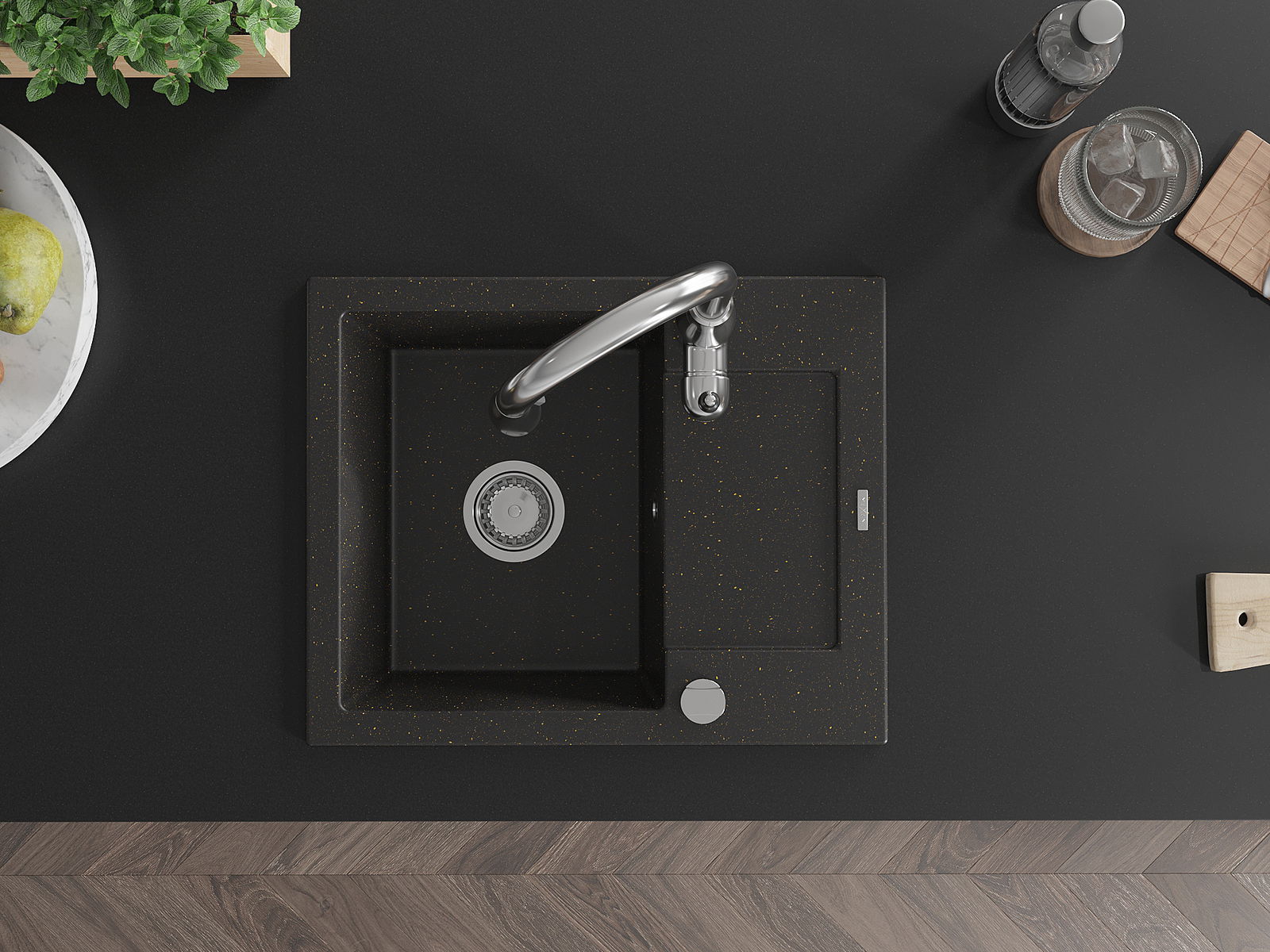 Povrch kuchynského drezu je odolný voči škvrnám a zafarbeniu, vďaka čomu sa ľahko udržiava a zachováva svoju farbu počas dlhého obdobia používania. Estetický a praktický doplnok pre každú kuchyňu.