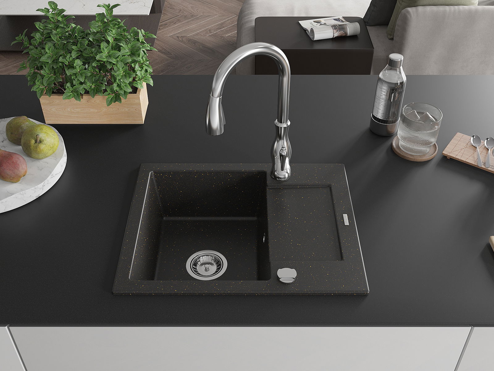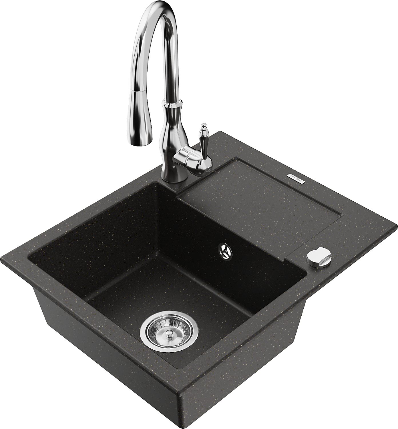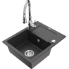Mexen Enzo granitový drez 1-komorový s odkvapkávačom a kuchynskou batériou Savita, čierny/zlatý metalizovaný