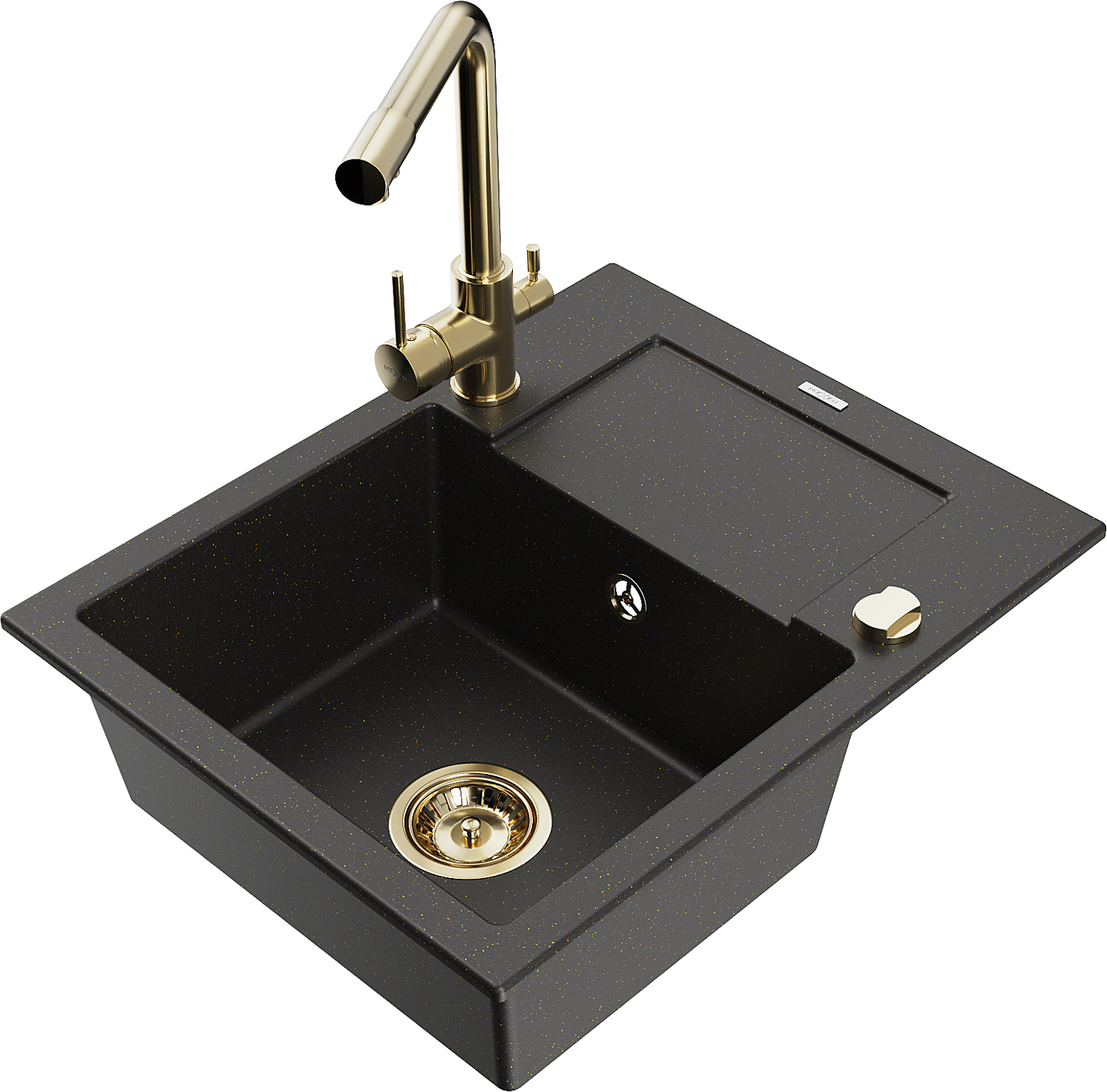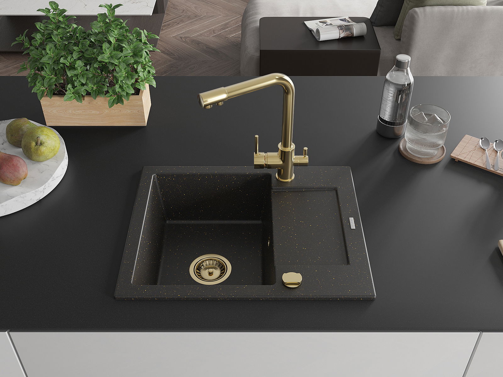 Mexen Enzo granitový kuchynský drez s odkvapkávačom a kuchynskou batériou Duero, čierny/zlatý metalik - 6506-75-671600-50