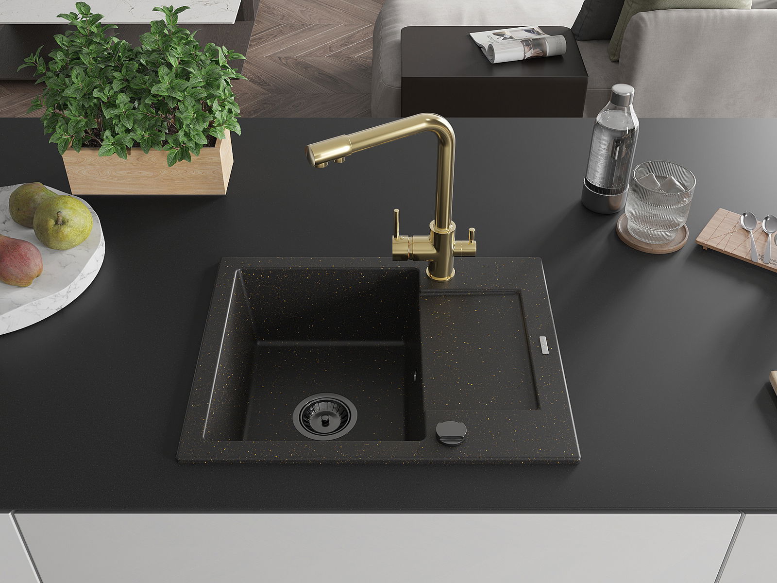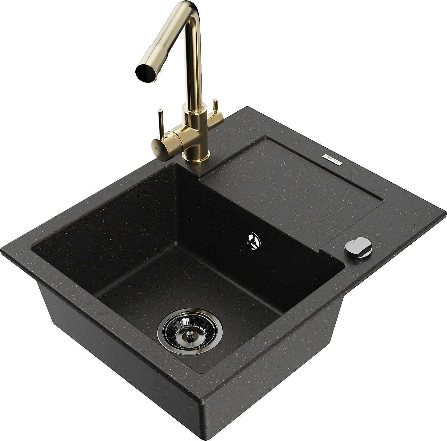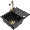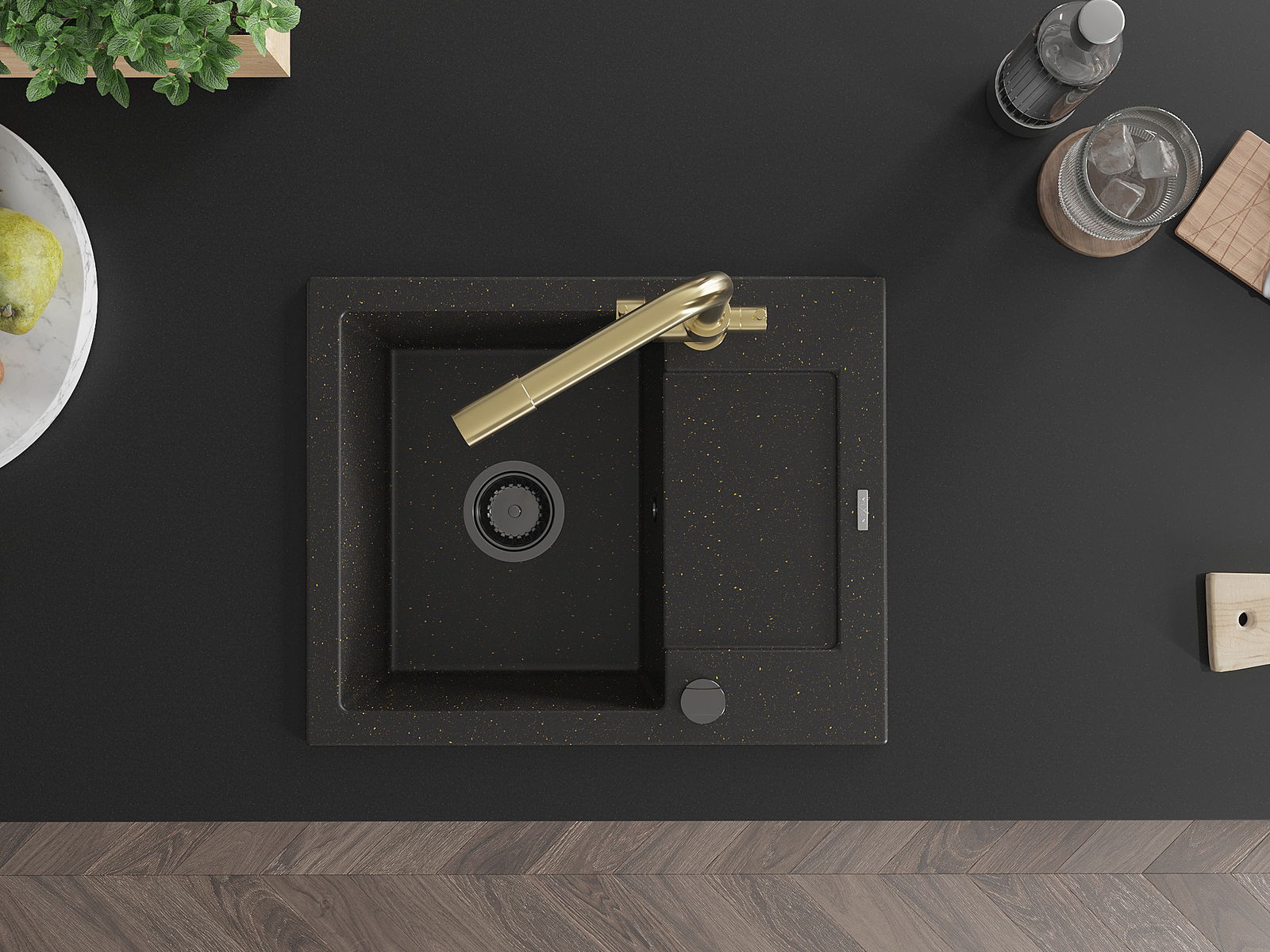Mexen Enzo žulový drez 1-komorový s odkvapkávačom a kuchynskou batériou Duero, čierny/zlatý metalik - 6506-75-671600-50-B