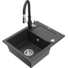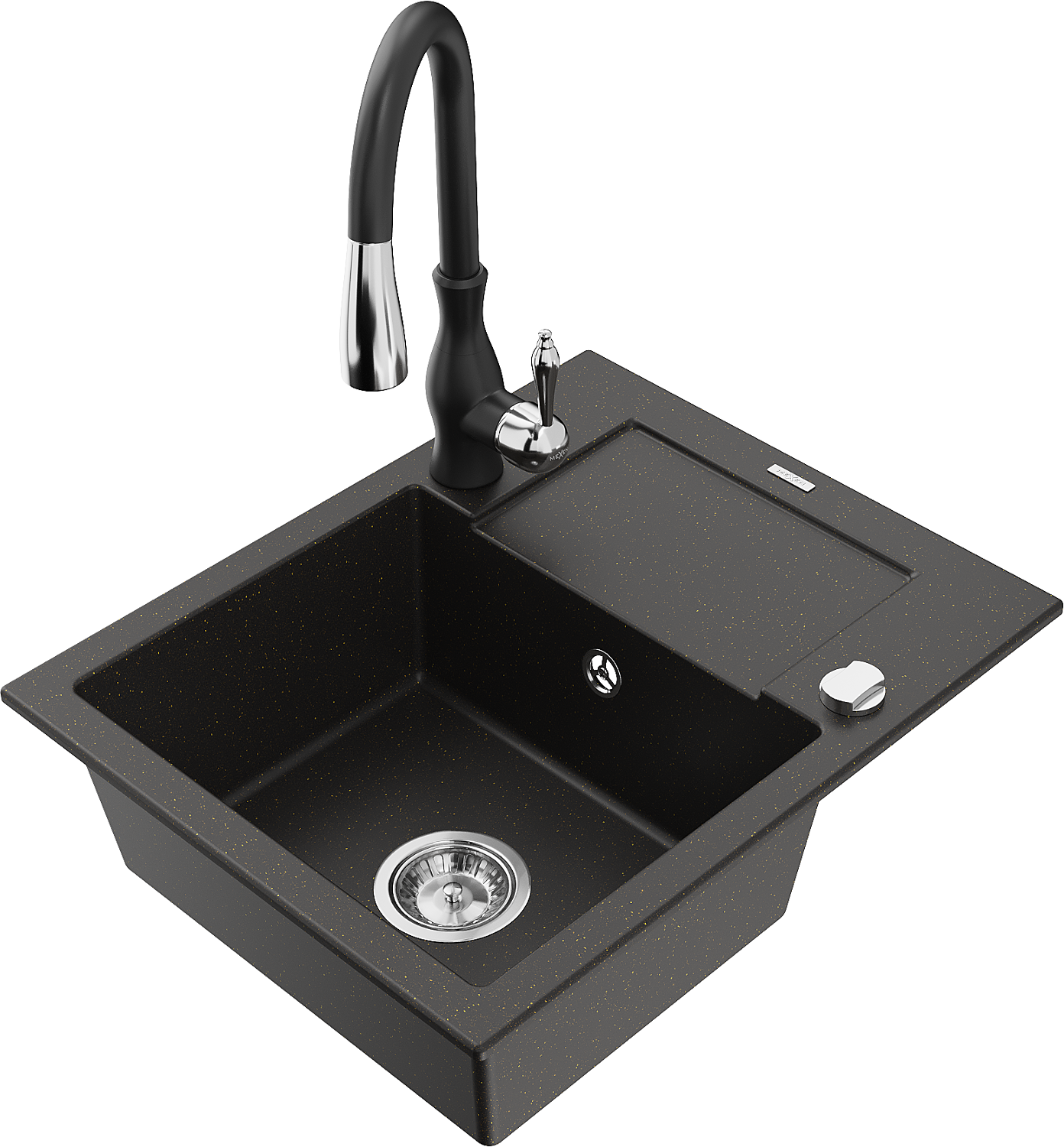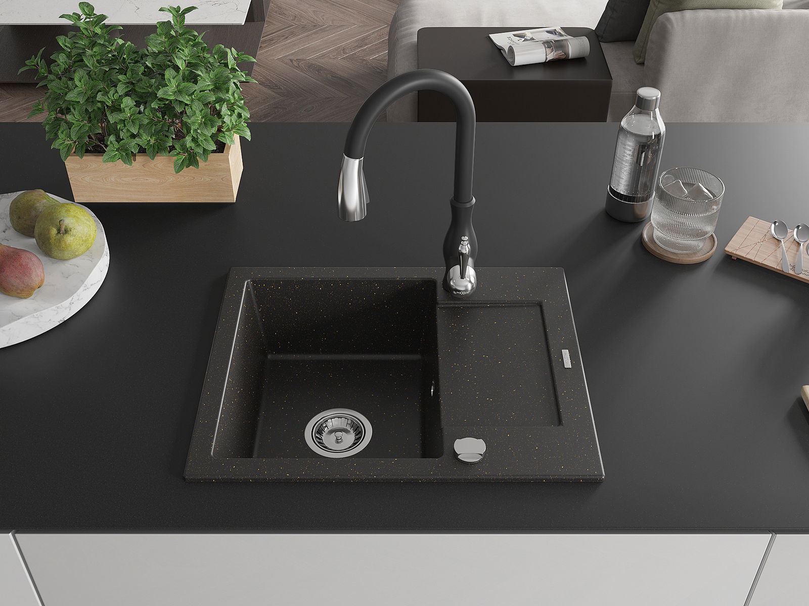 Mexen Enzo granitový drez 1-komorový s odkvapkávacou plochou a kuchynskou batériou Savita, čierny/zlatý metalický