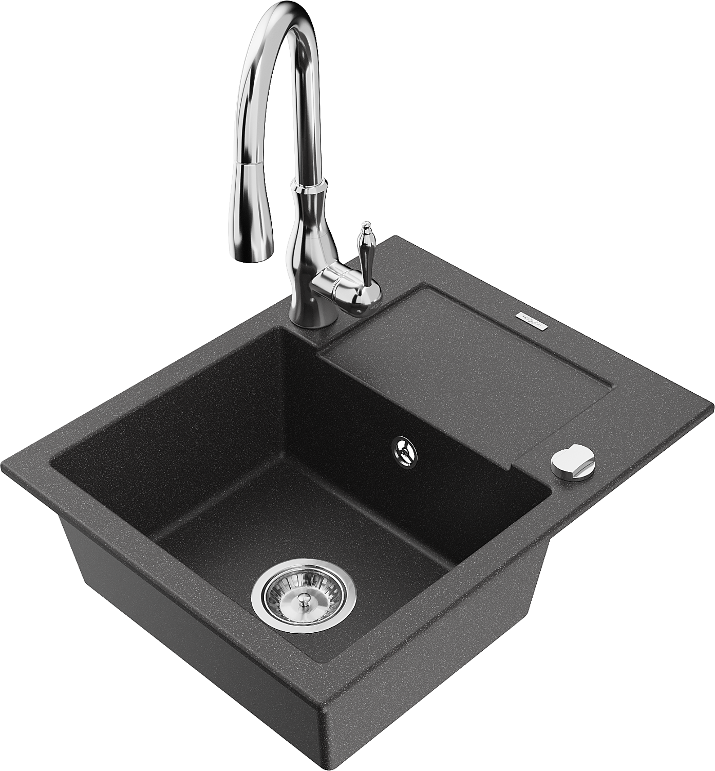 Mexen Enzo granitový drez 1-komorový s odkvapkávačom a kuchynskou batériou Savita, čierny škvrnitý - 6506-76-672601-00