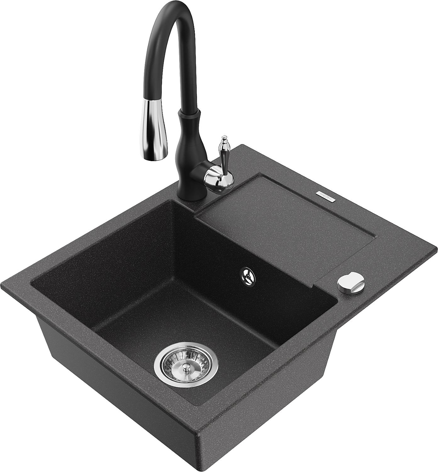 Mexen Enzo granitový drez 1-komorový s odkvapkávačom a kuchynskou batériou Savita, čierny škvrnitý - 6506-76-672601-70