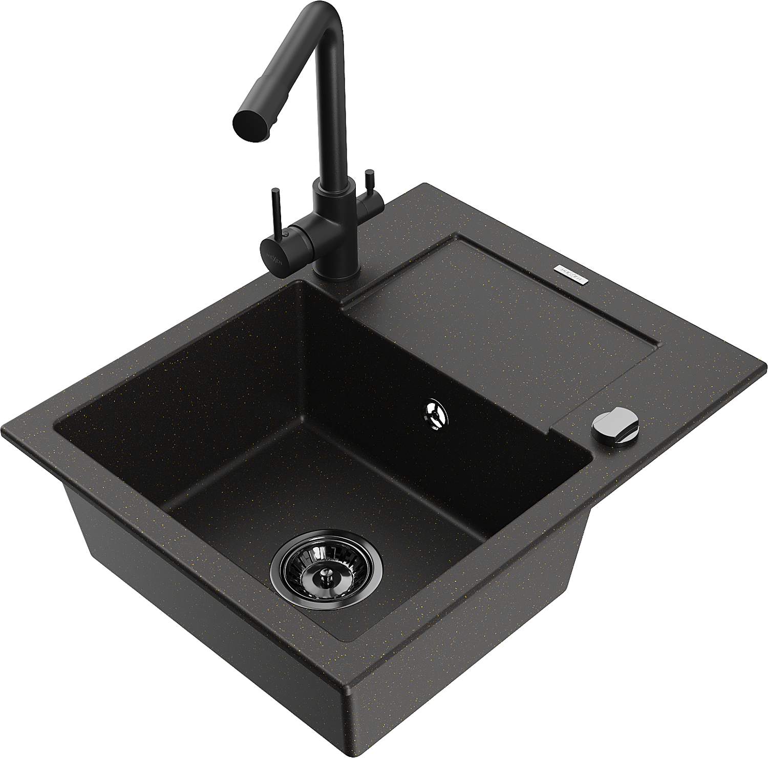 Mexen Enzo drez z granitu 1-komorový s odkvapkávačom a kuchynskou batériou Duero, čierny škvrnitý - 6506-76-671600-70-B