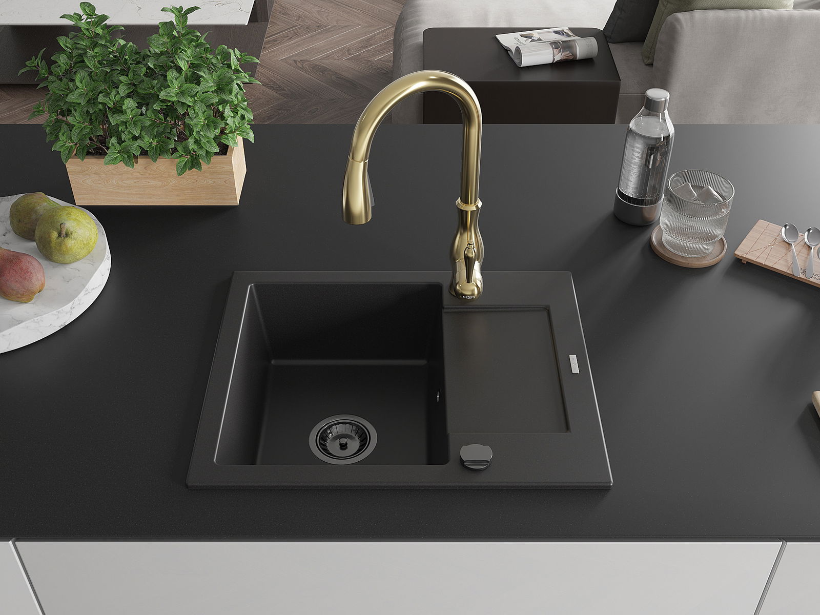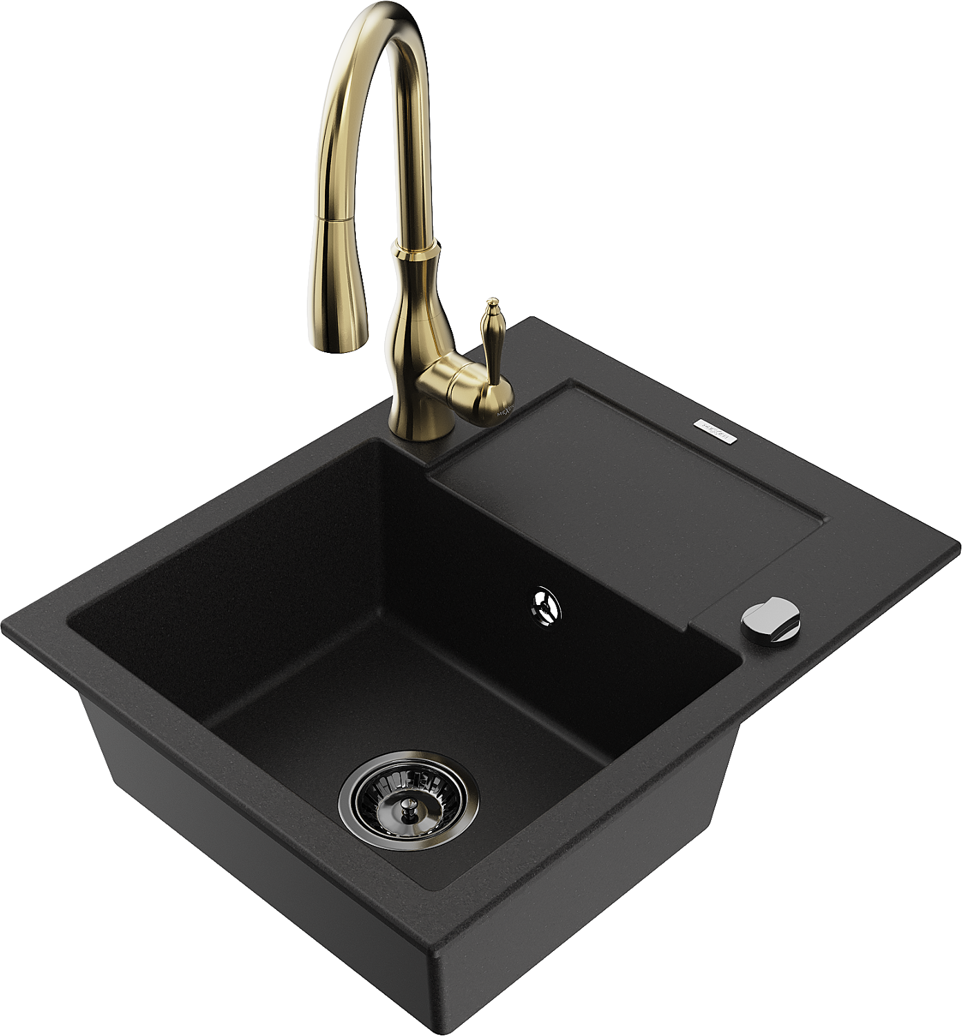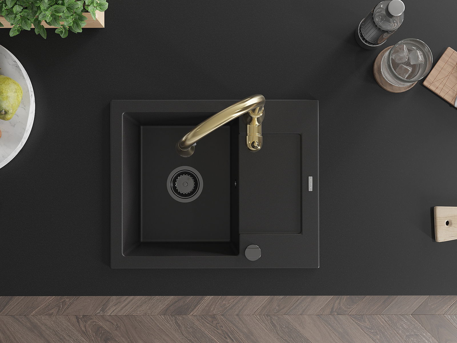 Mexen Enzo granitový kuchynský drevák s 1 komorou a odkvapkávačom a kuchynskou batériou Savita, čierny - 6506-77-672601-50-B