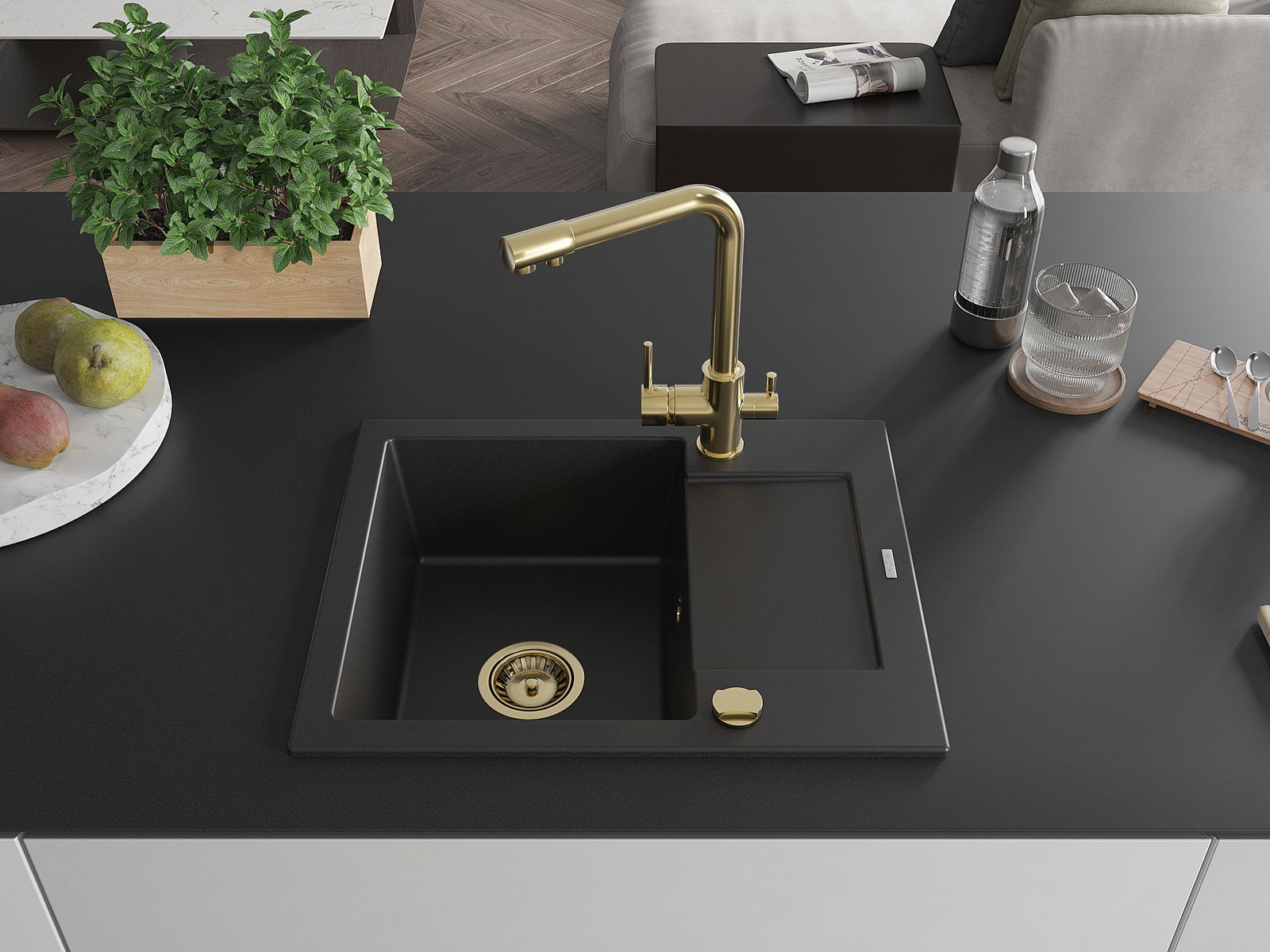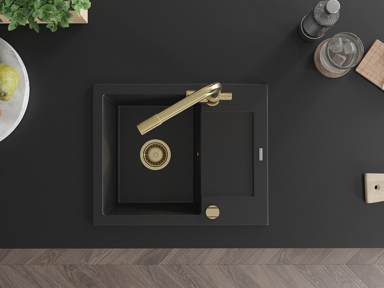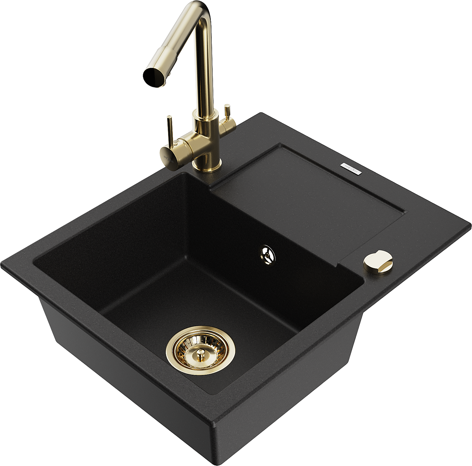 Mexen Enzo žulový drez 1-komorový s odkvapkávačom a kuchynskou batériou Duero, čierny - 6506-77-671600-50