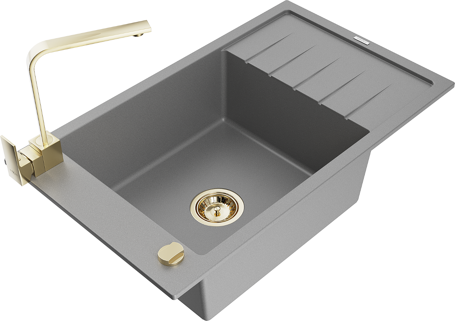 Mexen Elias jedno-komorový granitový drez s odkvapkávacou doskou a kuchynskou batériou Rita, sivý - 6511-71-670300-50