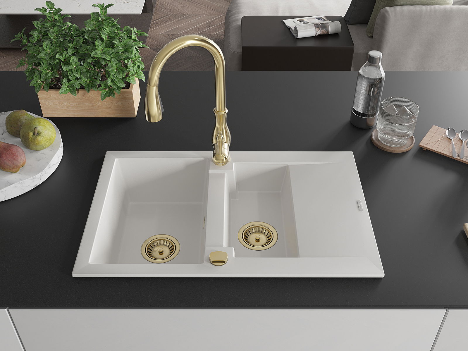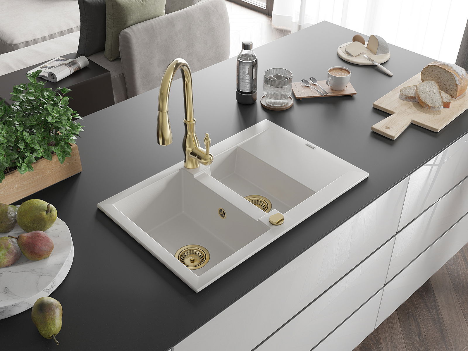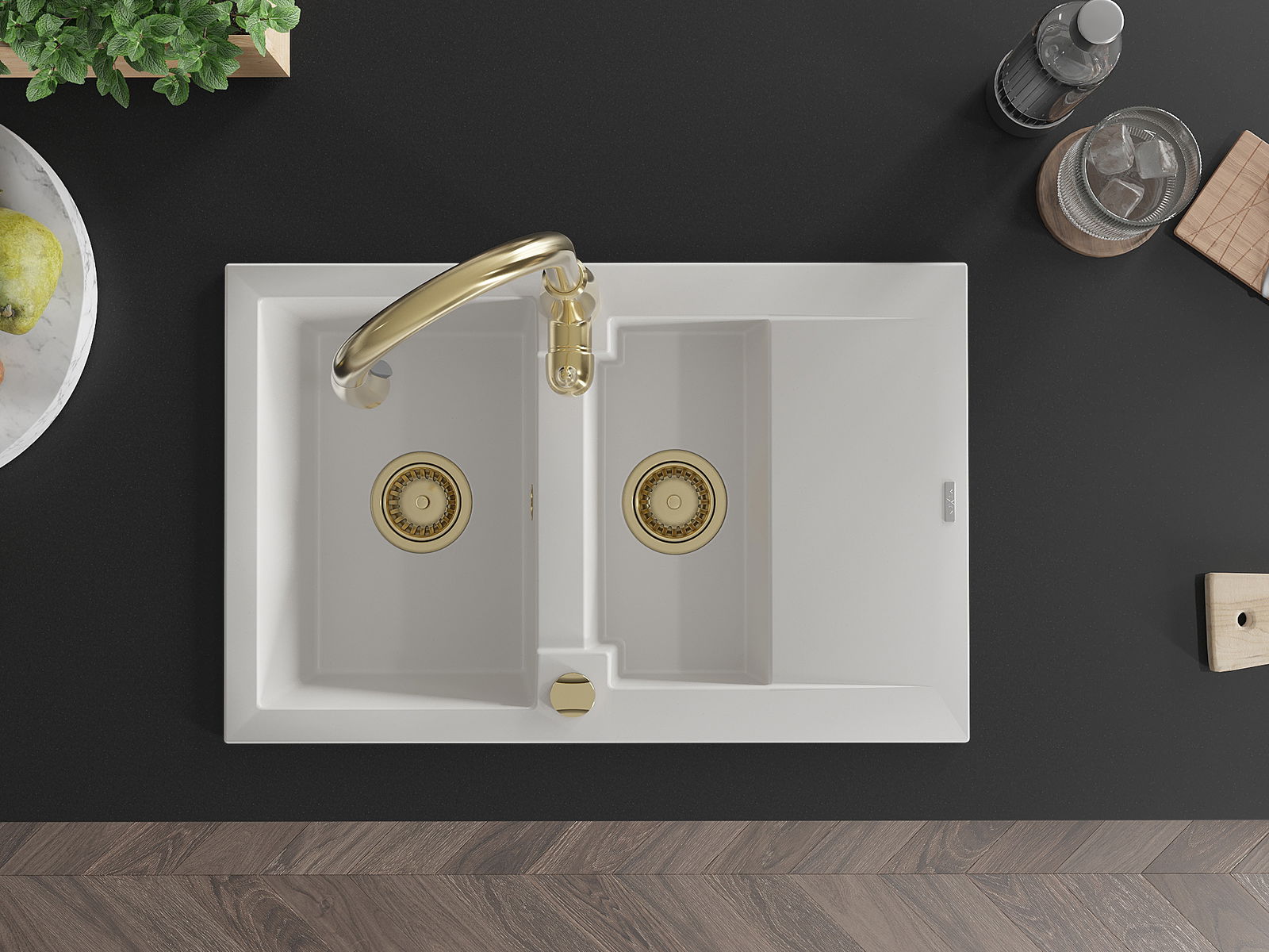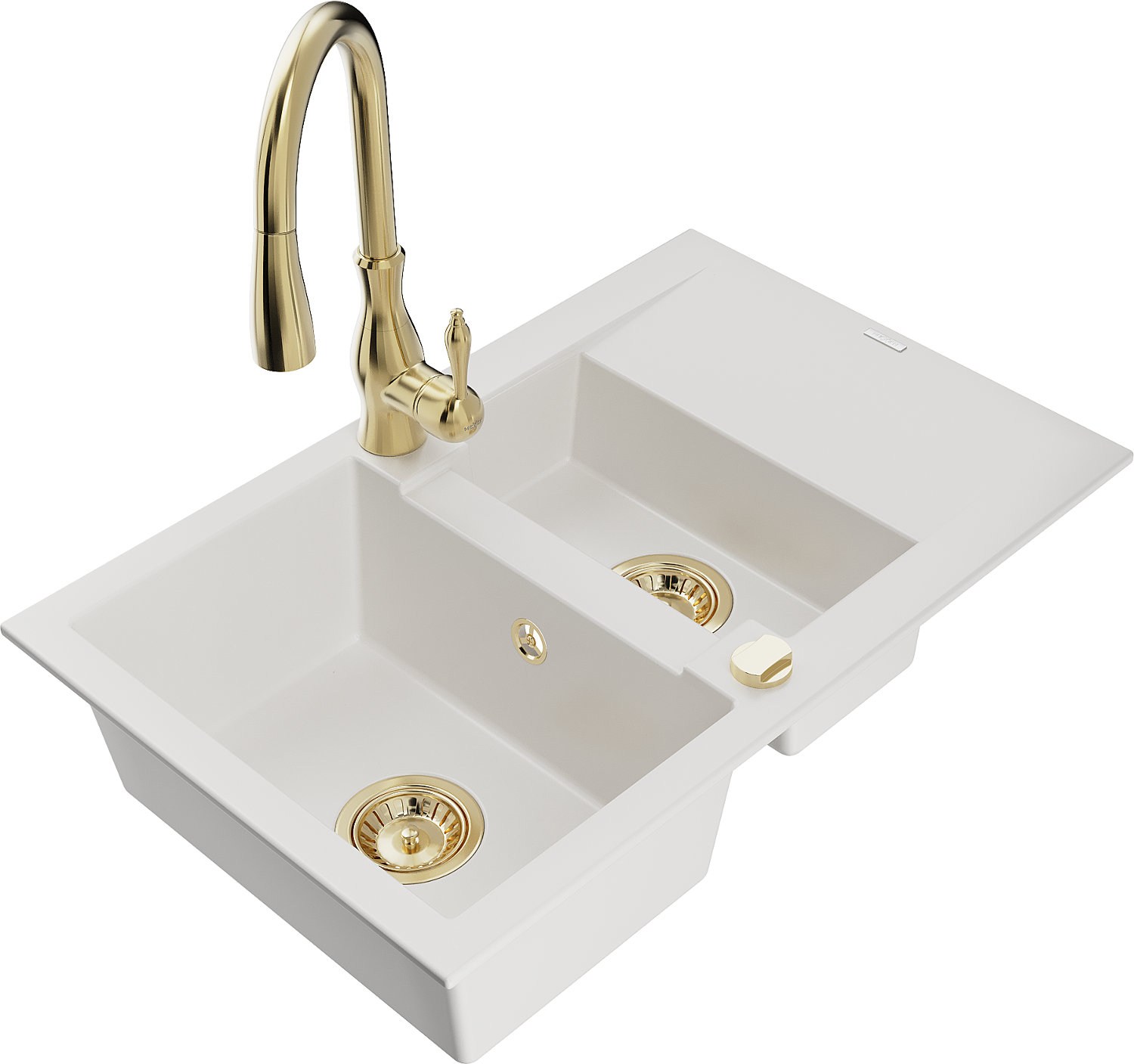 Mexen Gaspar žulový drez 1,5-komorový s odkvapkávačom a kuchynskou batériou Savita, biely - 6507-20-672601-50