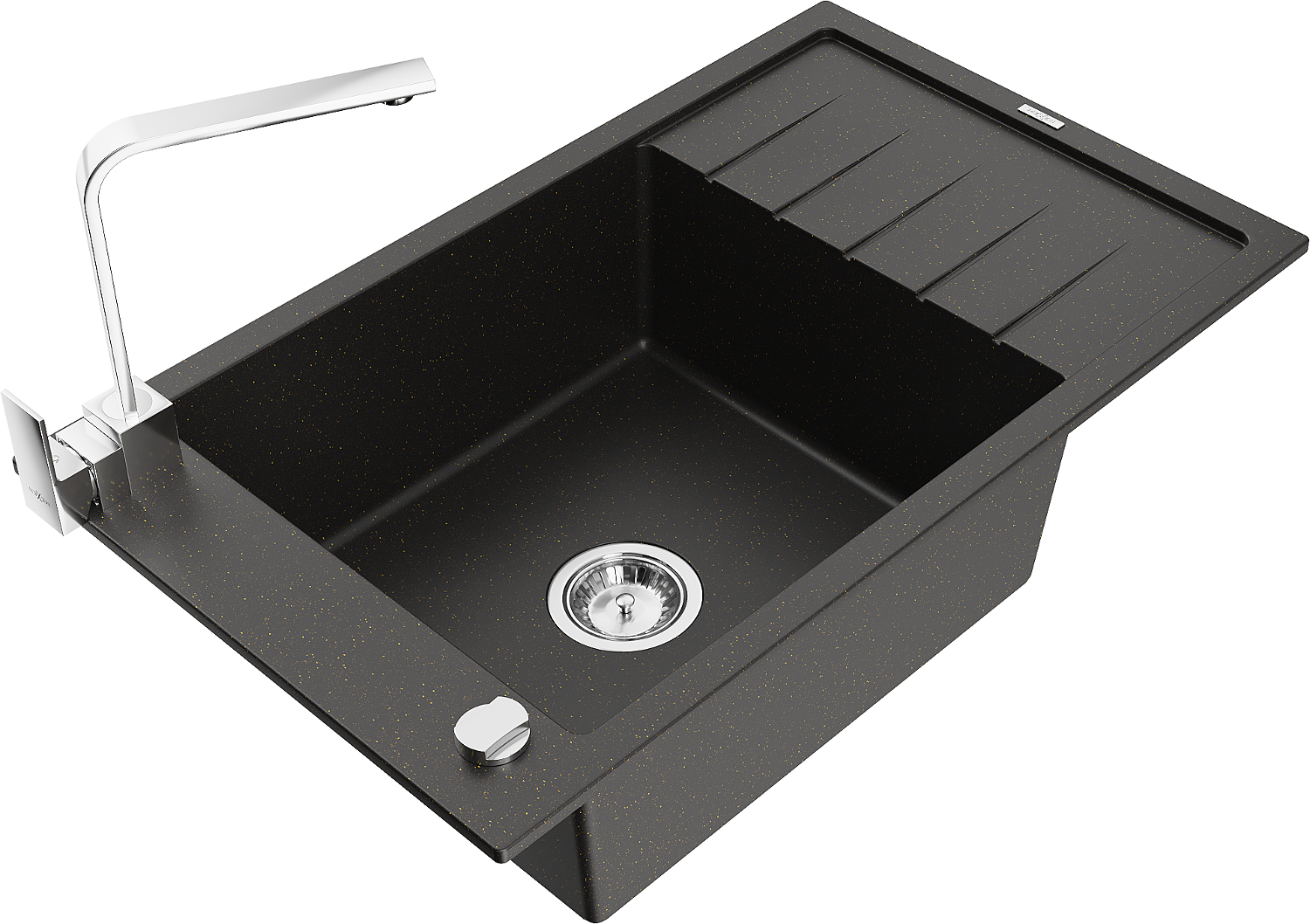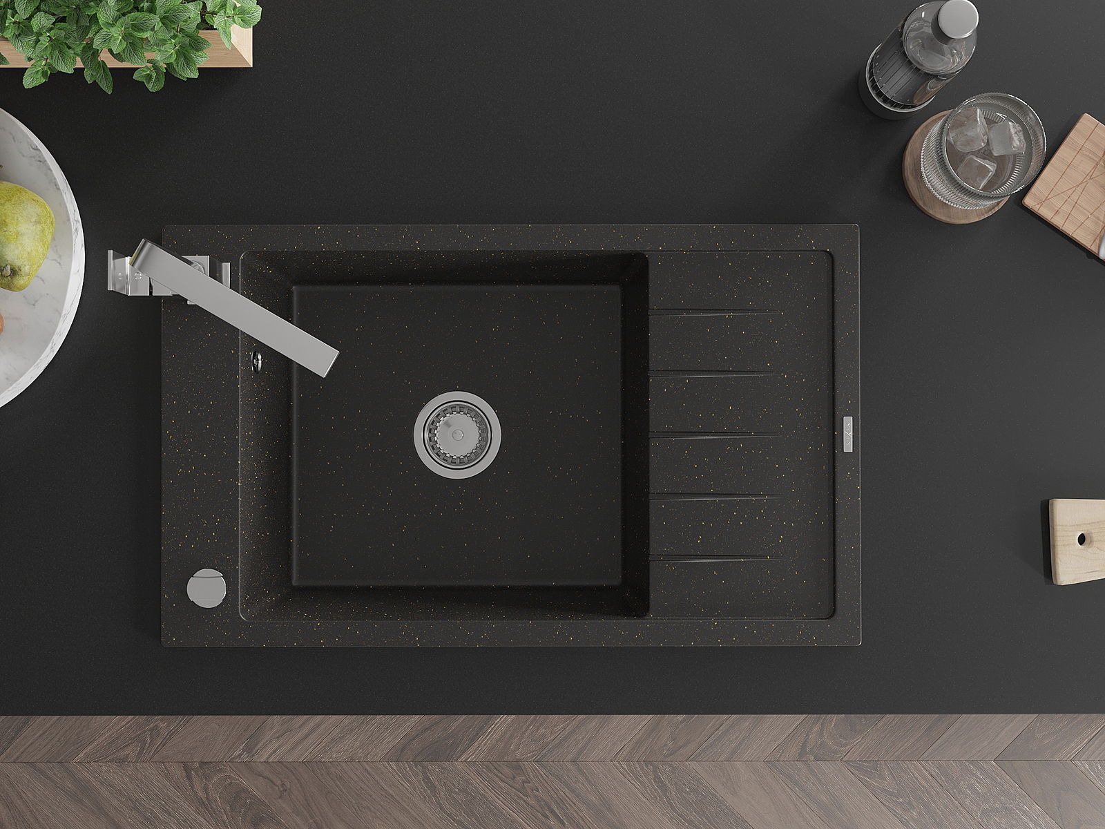 Mexen Elias granitový drez s 1 komorou s odkvapkávačom a kuchynskou batériou Rita, čierny/zlatý metalický