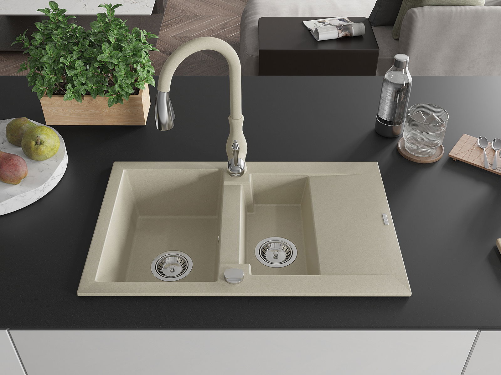 Mexen Gaspar žulový drez 1,5-komorový s odkvapkávačom a kuchynskou batériou Savita, béžový - 6507-69-672601-69