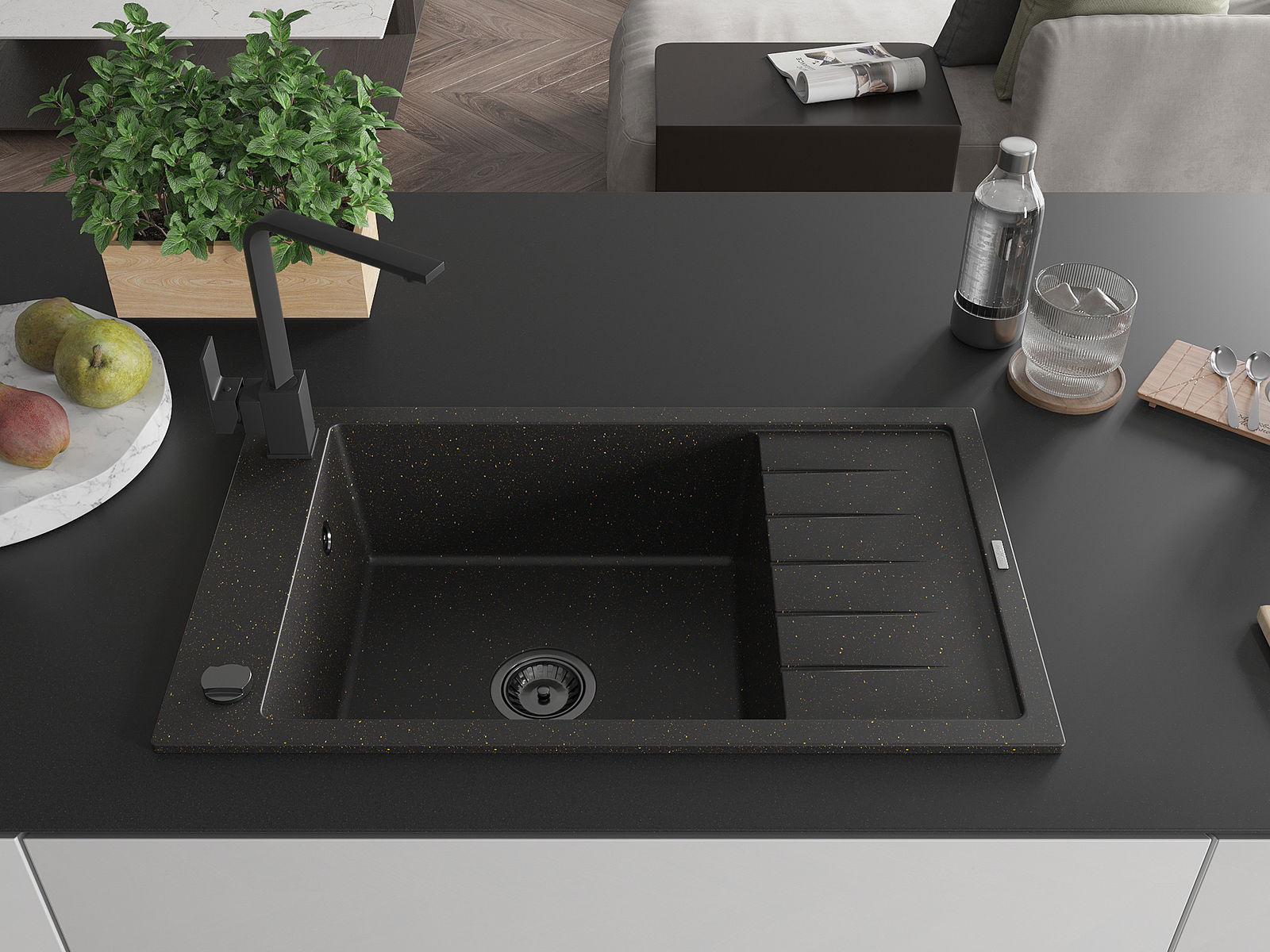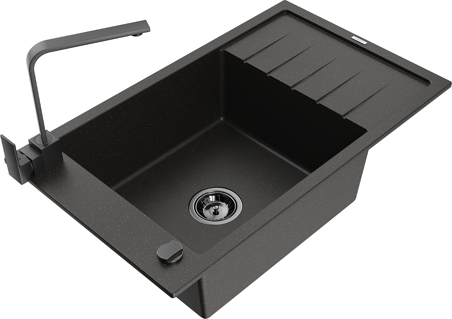 Mexen Elias žulový drez 1-komorový s odkvapkávačom a kuchynskou batériou Rita, čierny/zlatý metalik - 6511-75-670300-70-B