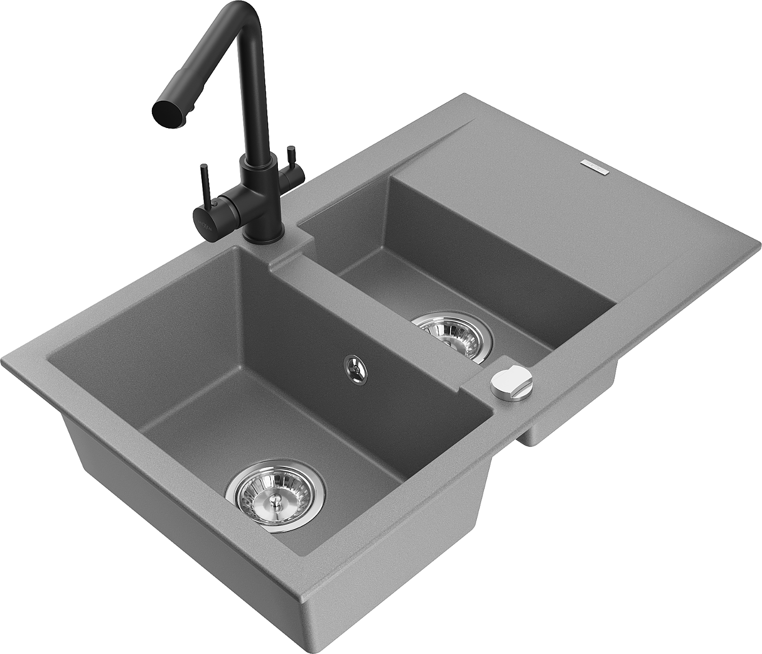 Mexen Gaspar žulový drezy 1,5-komorový s odkvapkávacou plochou a kuchynskou batériou Duero, sivý - 6507-71-671600-70
