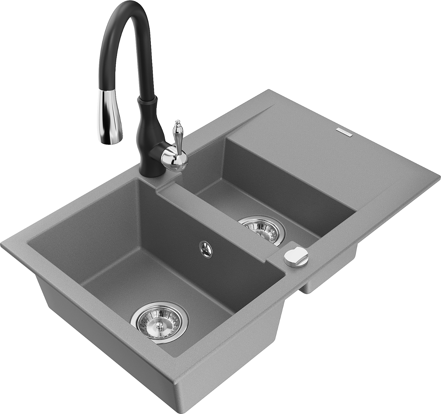 Mexen Gaspar granitový kuchynský drez 1,5-komorový s odkvapkávačom a kuchynskou batériou Savita, sivý - 6507-71-672601-70
