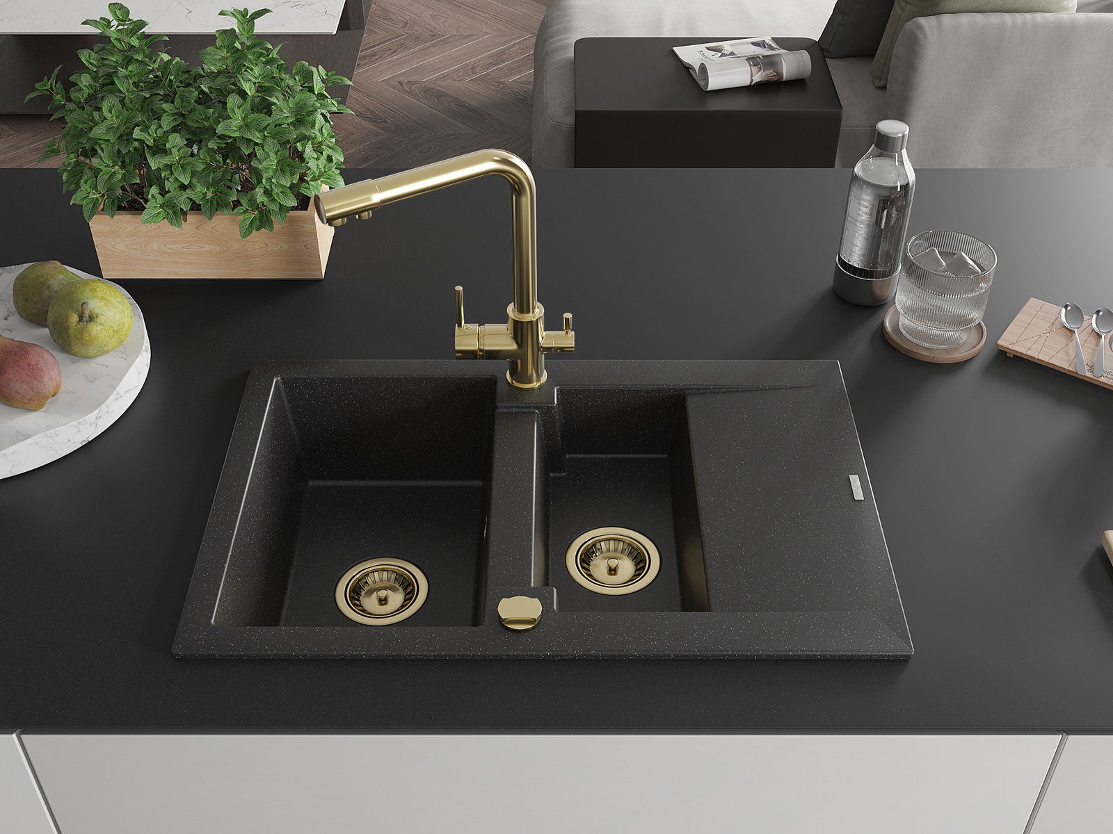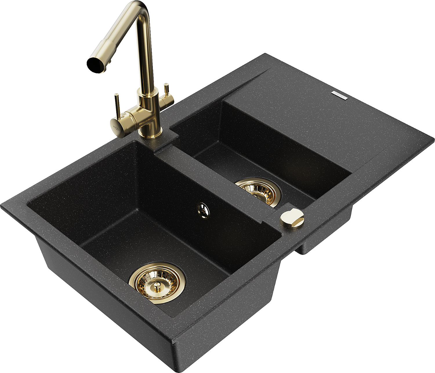Mexen Gaspar 1,5-komorový žulový drez s odkvapkaním a kuchynskou batériou Duero, čierny/strieborný - 6507-73-671600-50