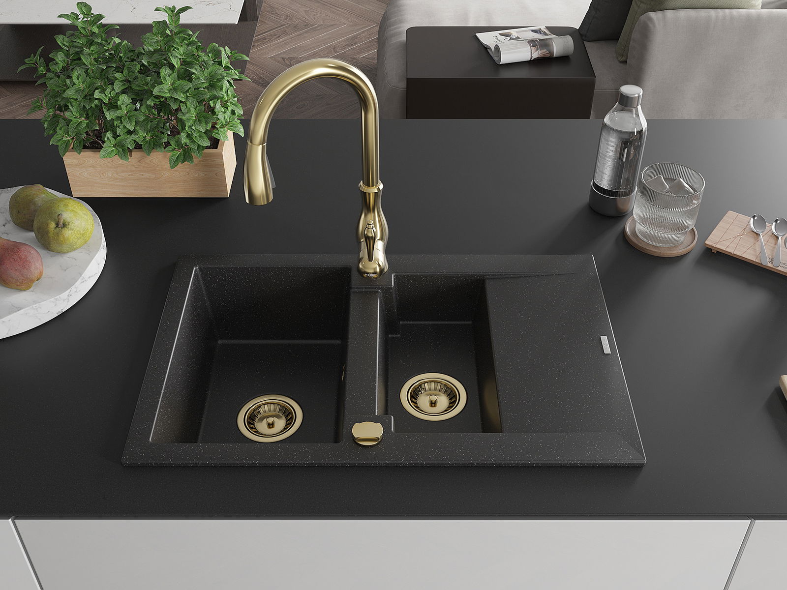 Mexen Gaspar granitový drez s 1,5 komorou s odkvapkávačom a kuchynskou batériou Savita, čierny/strieborný - 6507-73-672601-50