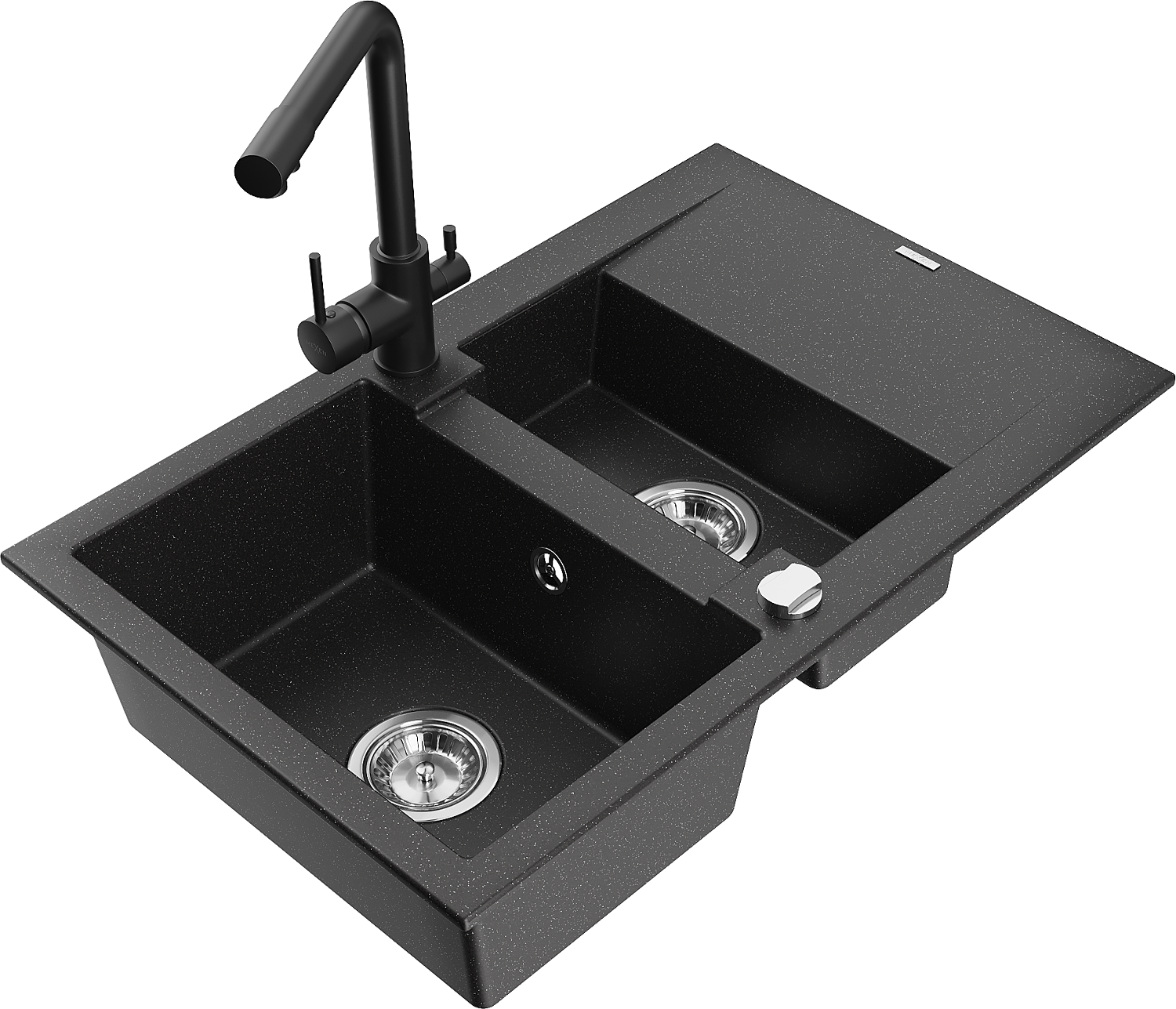 Mexen Gaspar žulový drez 1,5-komorový s odkvapkávačom a kuchynskou batériou Duero, čierny/strieborný - 6507-73-671600-70