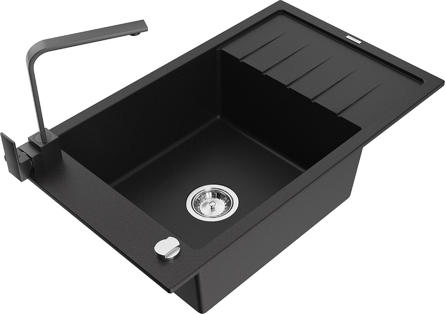 Mexen Elias žulový drez 1-komorový s odkvapkávačom a kuchynskou batériou Rita, čierny - 6511-77-670300-70