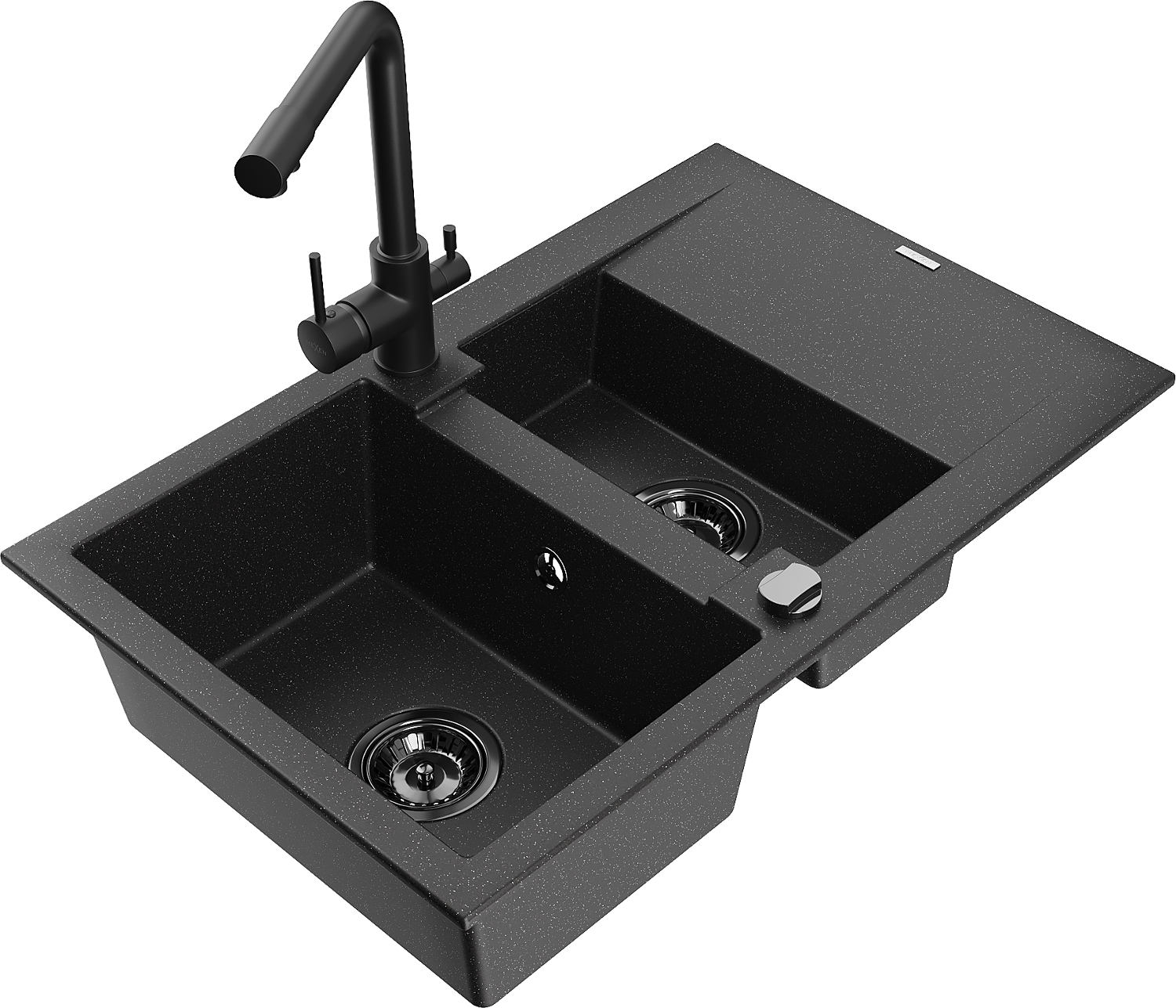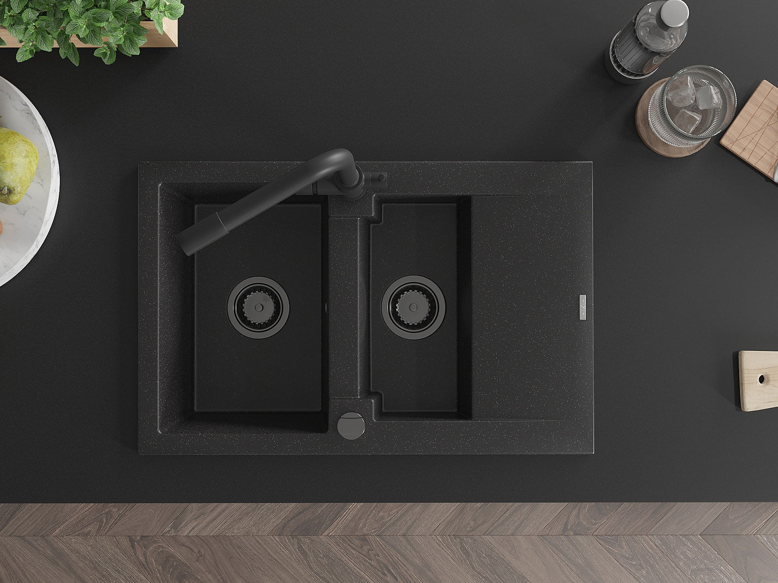 Mexen Gaspar žulový drez 1,5-komorový s odkvapkávačom a kuchynskou batériou Duero, čierno/sivý - 6507-73-671600-70-B