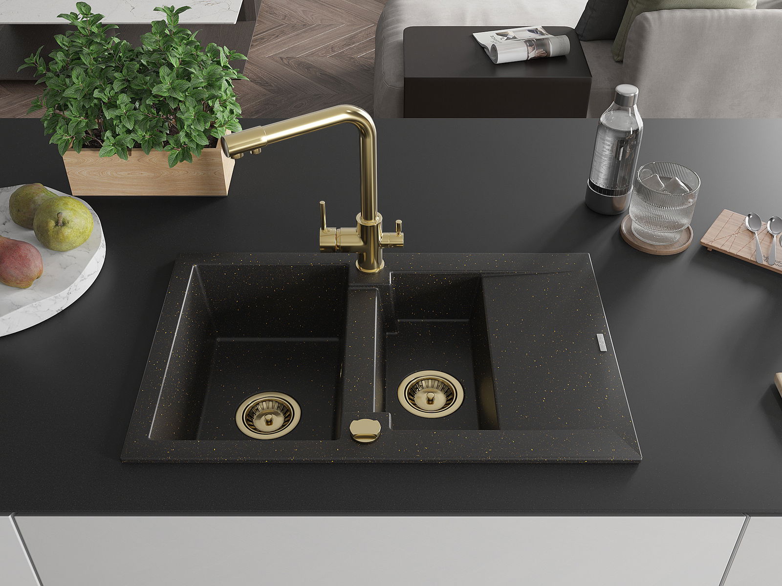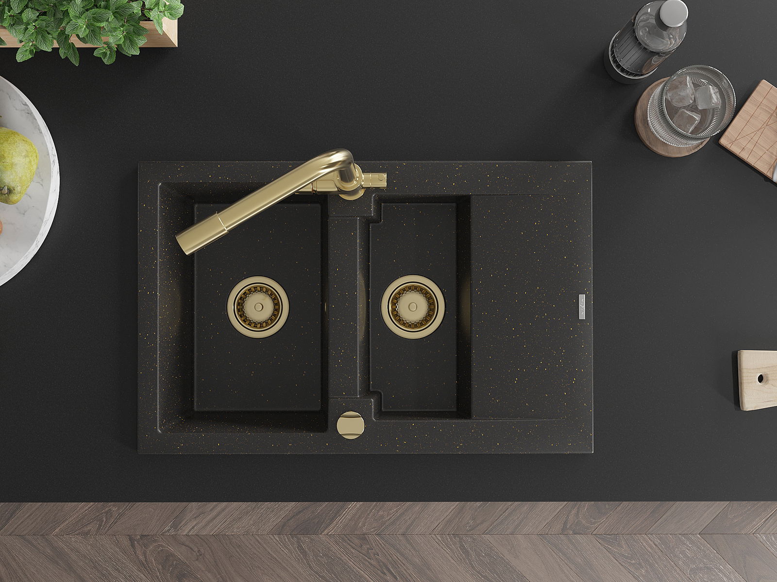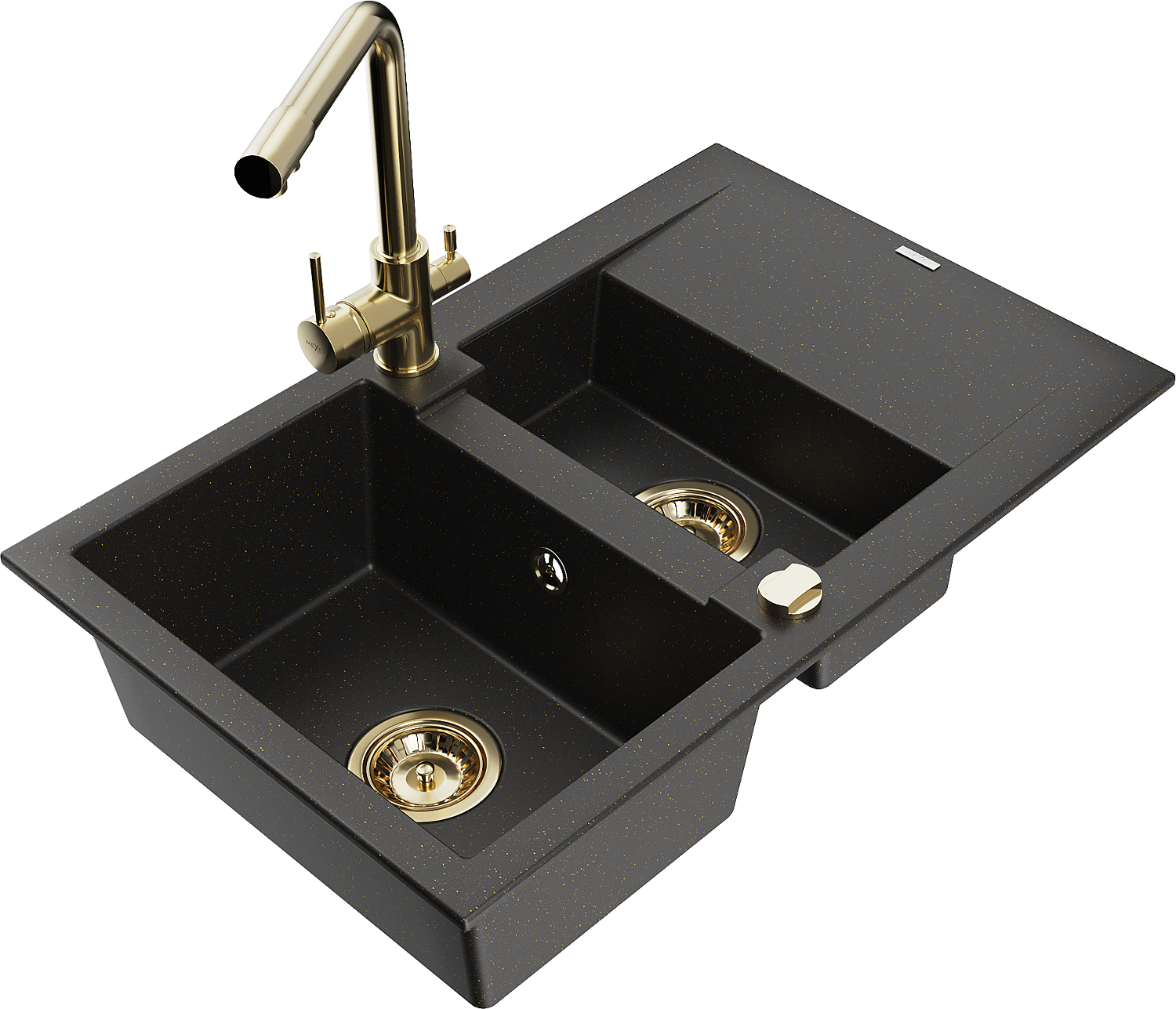 Mexen Gaspar granitový drez 1,5-komorový s odkvapkávačom a kuchynskou batériou Duero, čierny/zlatý metalický