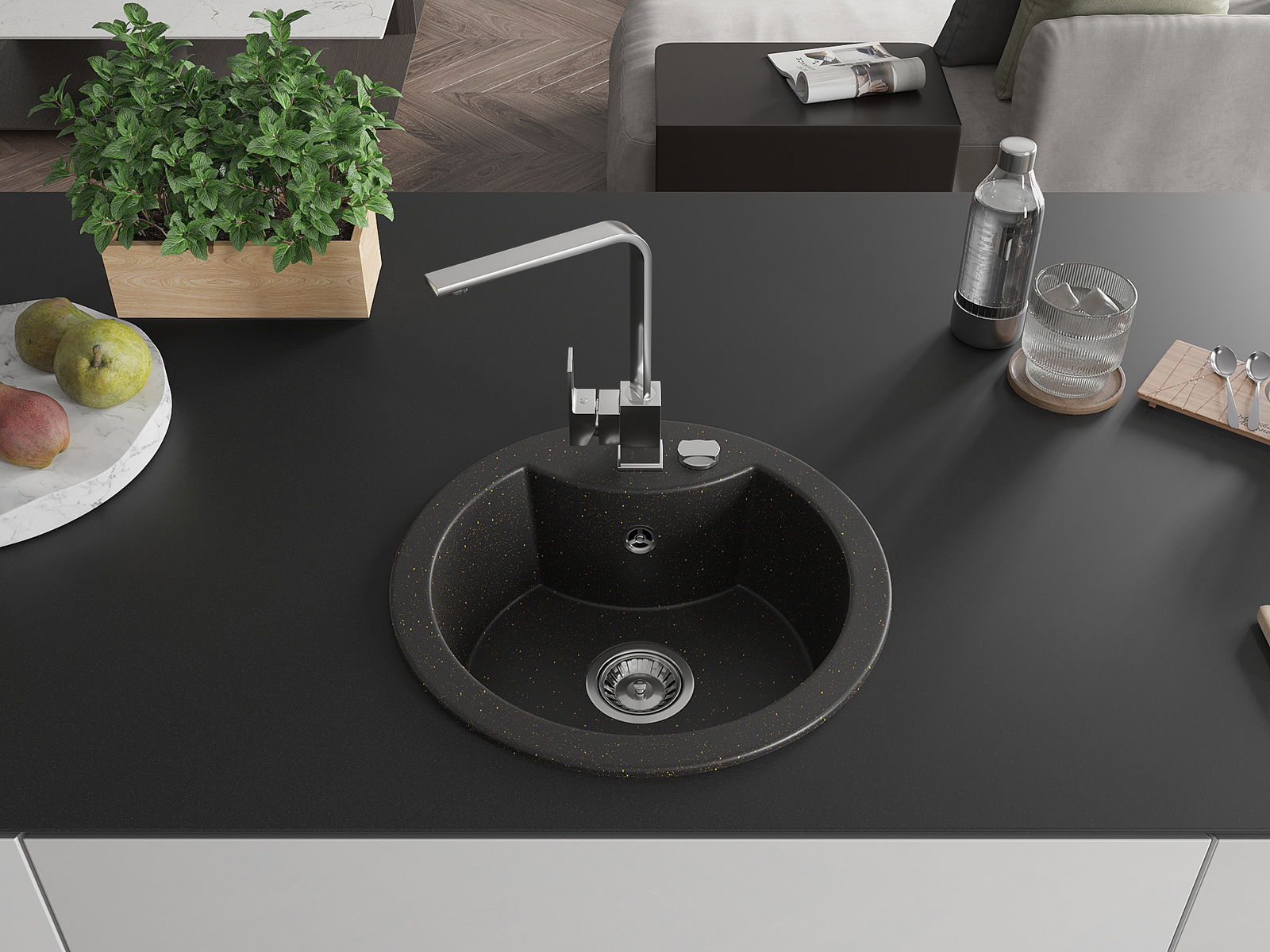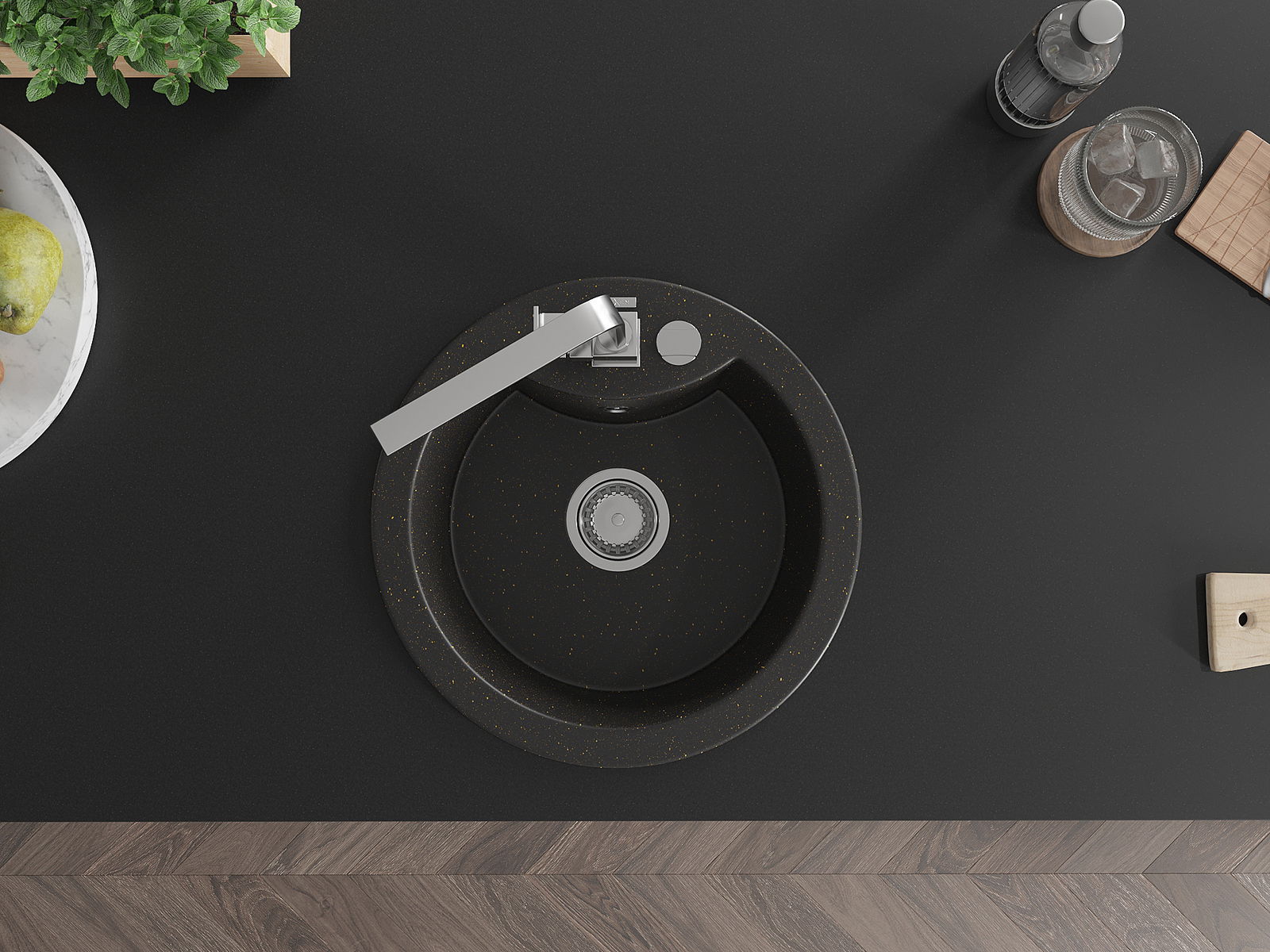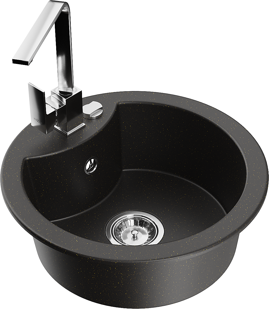 Mexen Diego granitový drez 1-komorový s kuchynskou batériou Rita, čierny/zlatý metalik - 6512-75-670300-00