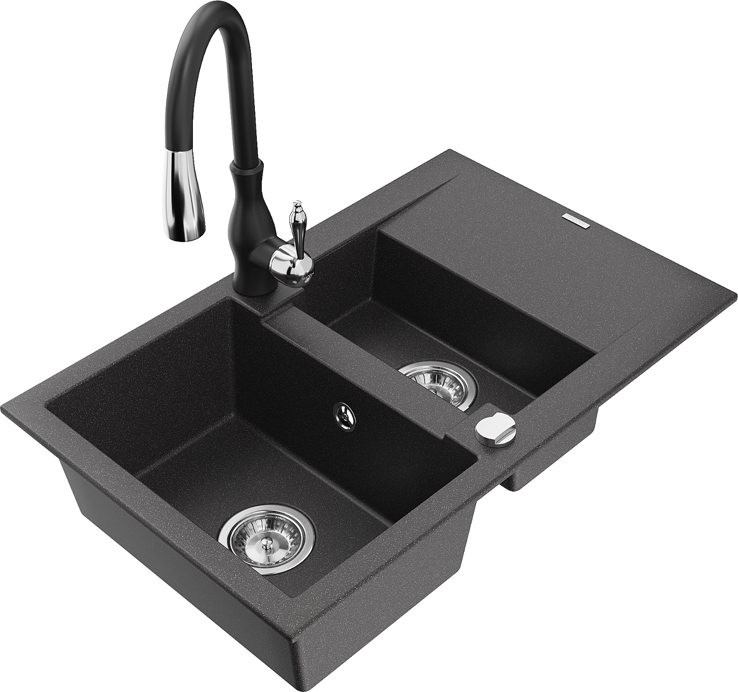 Mexen Gaspar granitový drez 1,5-komorový s odkvapkávačom a kuchynskou batériou Savita, čierny bodkovaný - 6507-76-672601-70