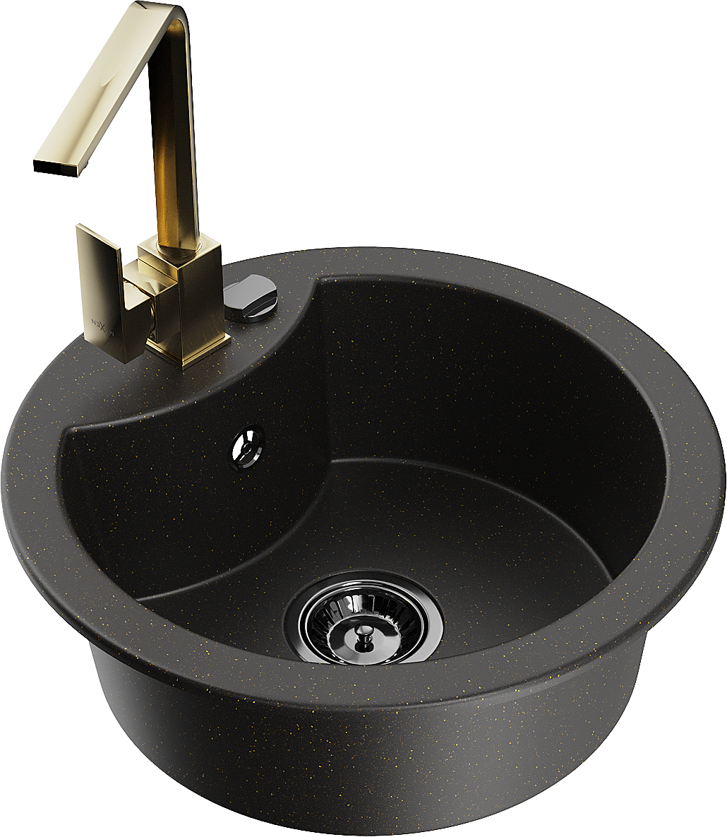 Mexen Diego granitový kuchynský drez s 1 komorou a kuchynskou batériou Rita, čierno/zlatý metalik - 6512-75-670300-50-B