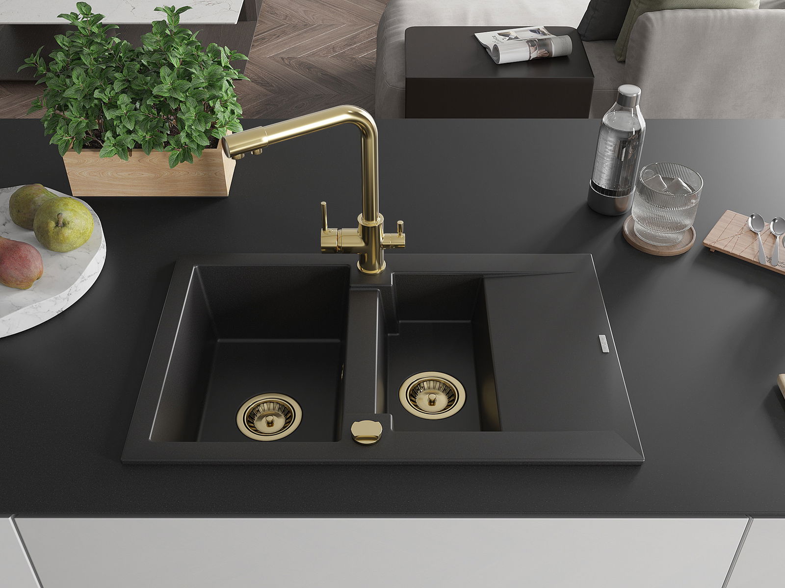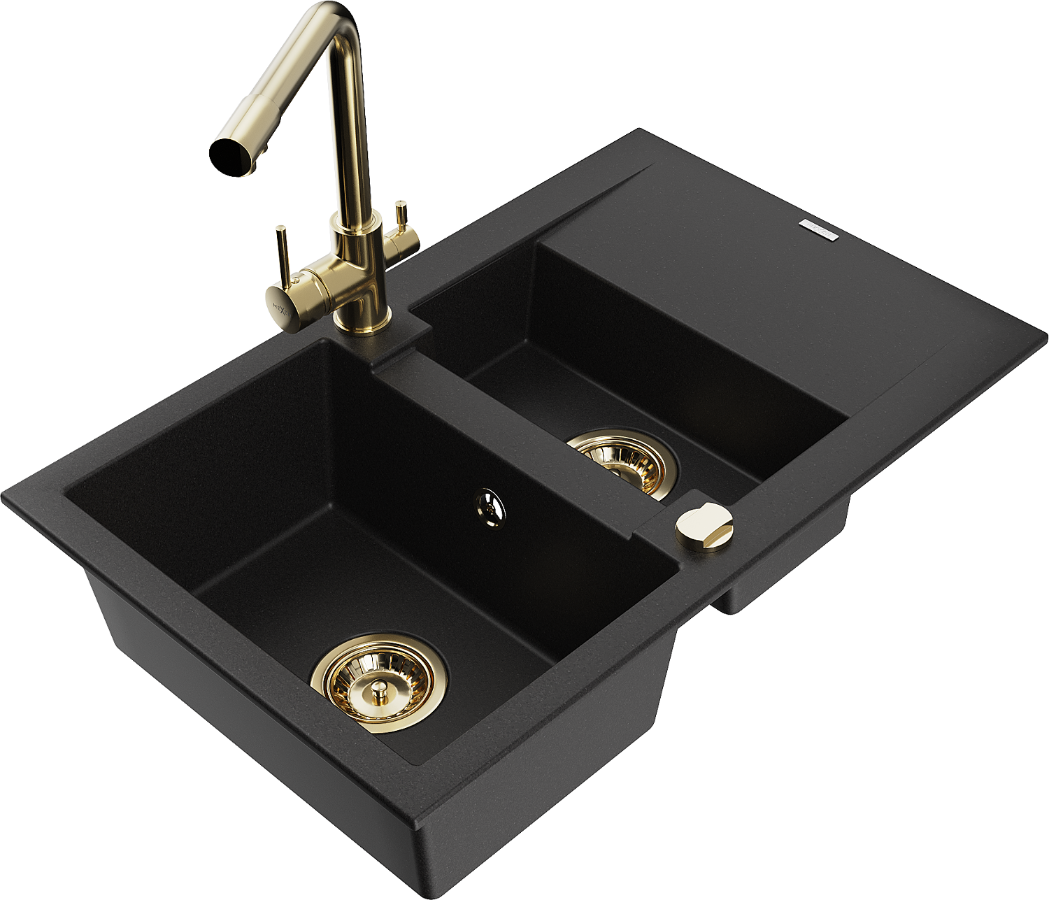 Mexen Gaspar granitový drez 1,5-komorový s odkvapkávačom a kuchynskou batériou Duero, čierny - 6507-77-671600-50