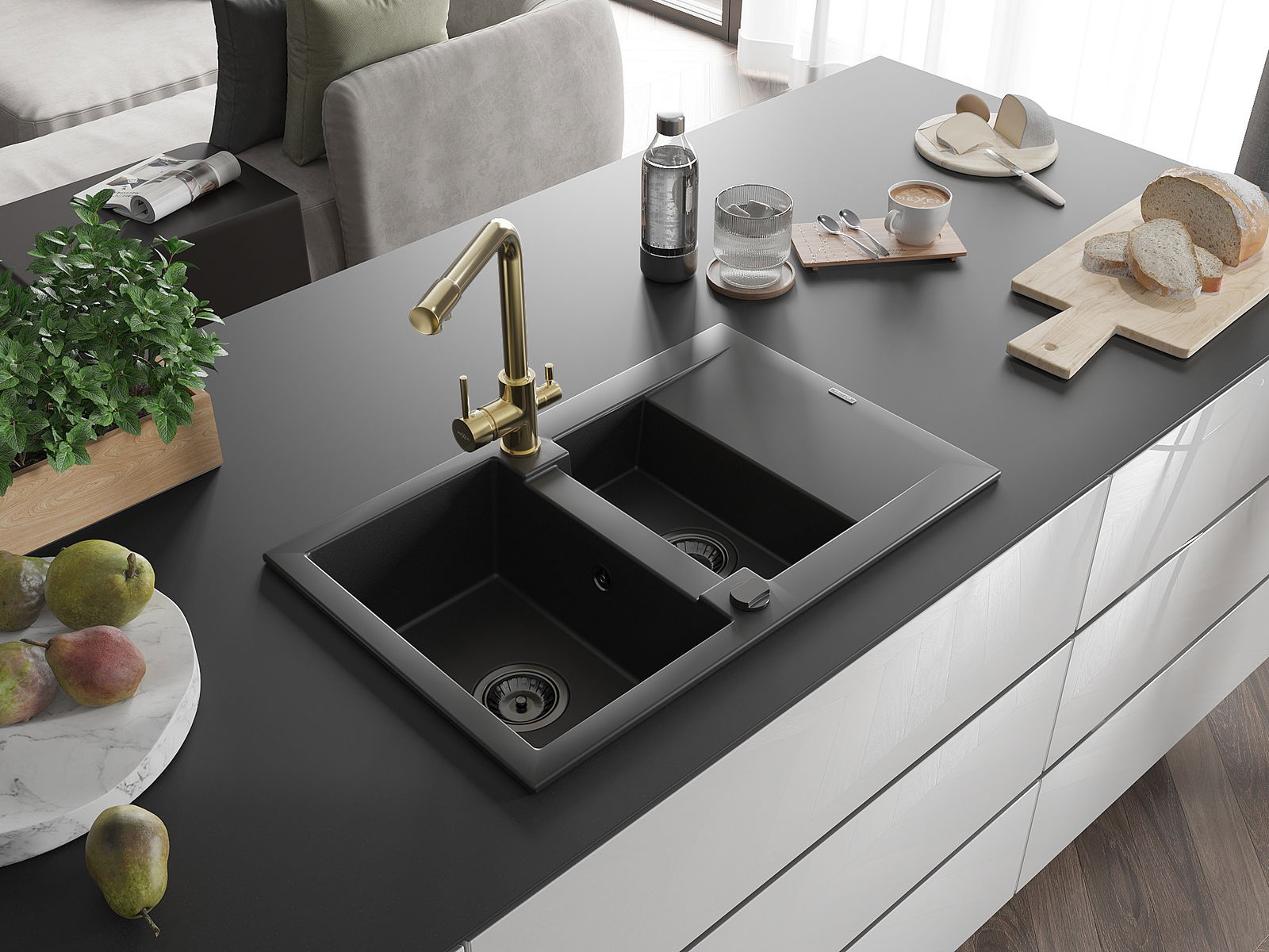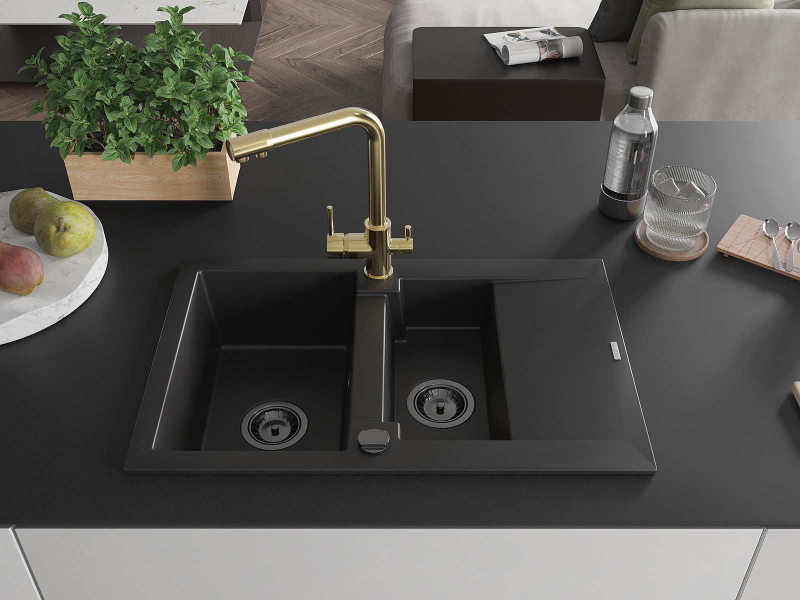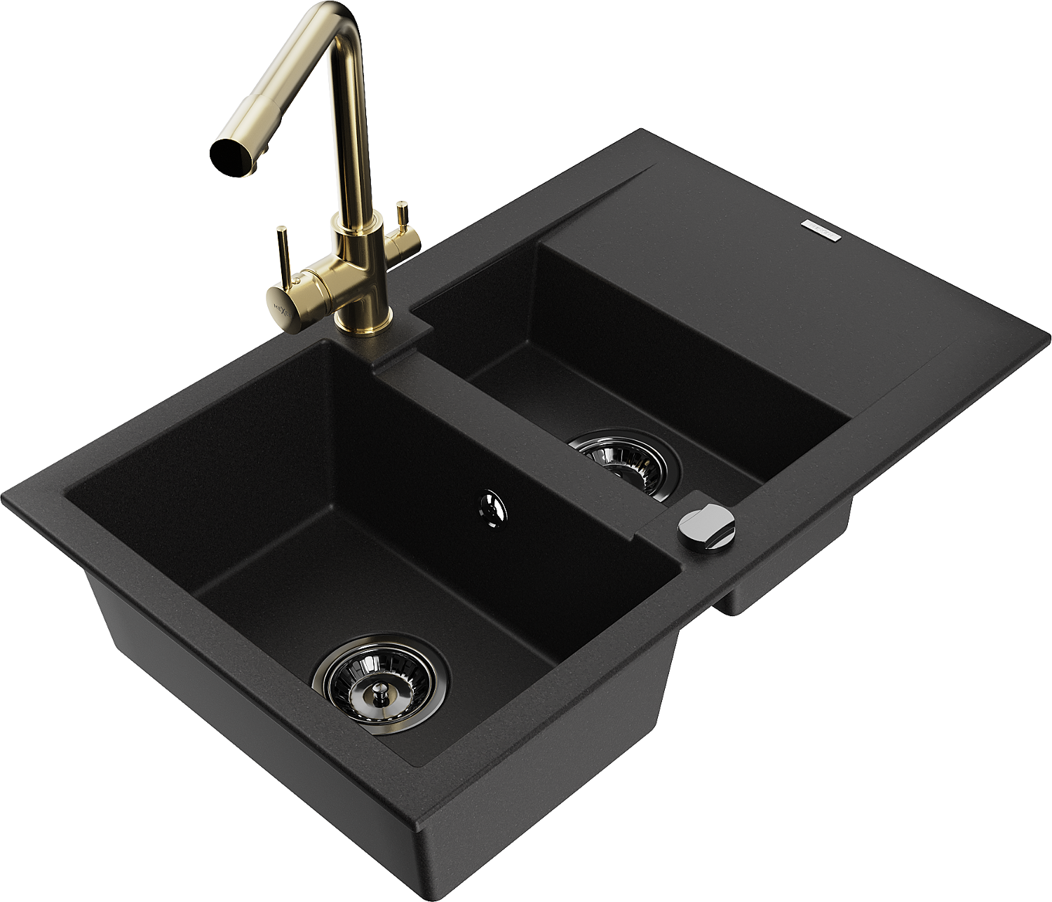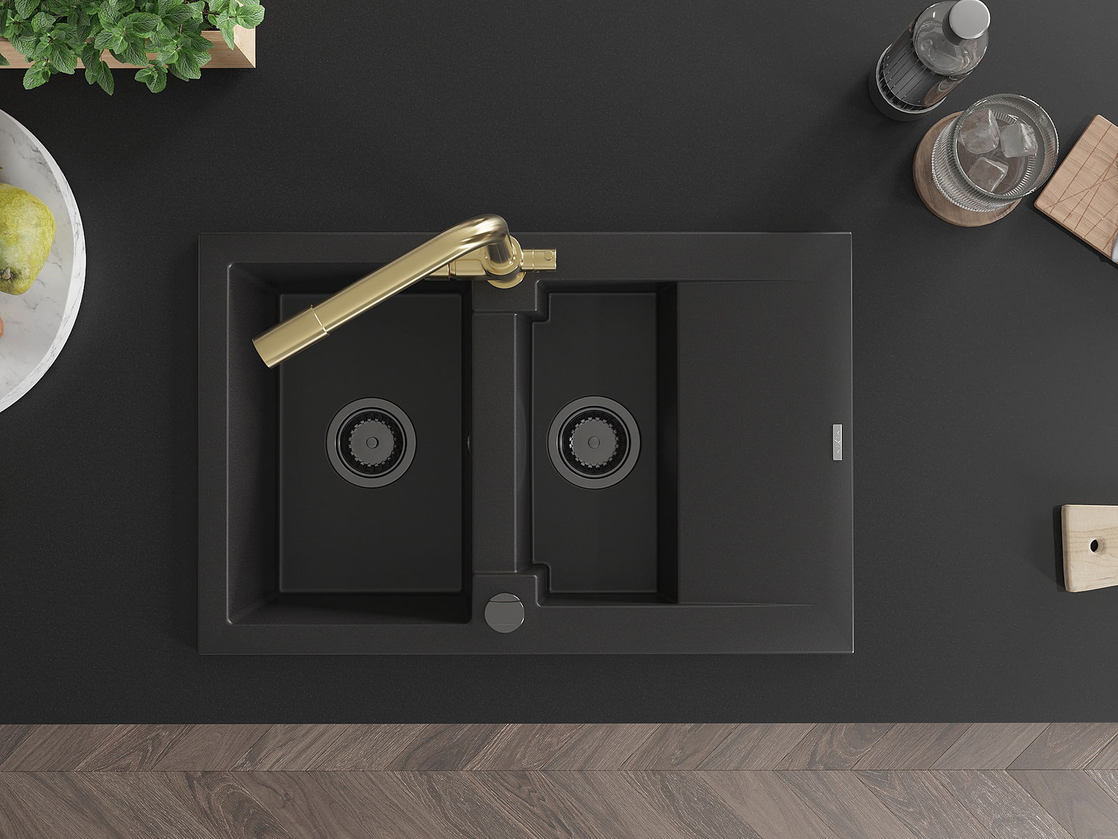 Mexen Gaspar žulový kuchynský drez s 1,5-komorou, odkvapkávačom a kuchynskou batériou Duero, čierny - 6507-77-671600-50-B