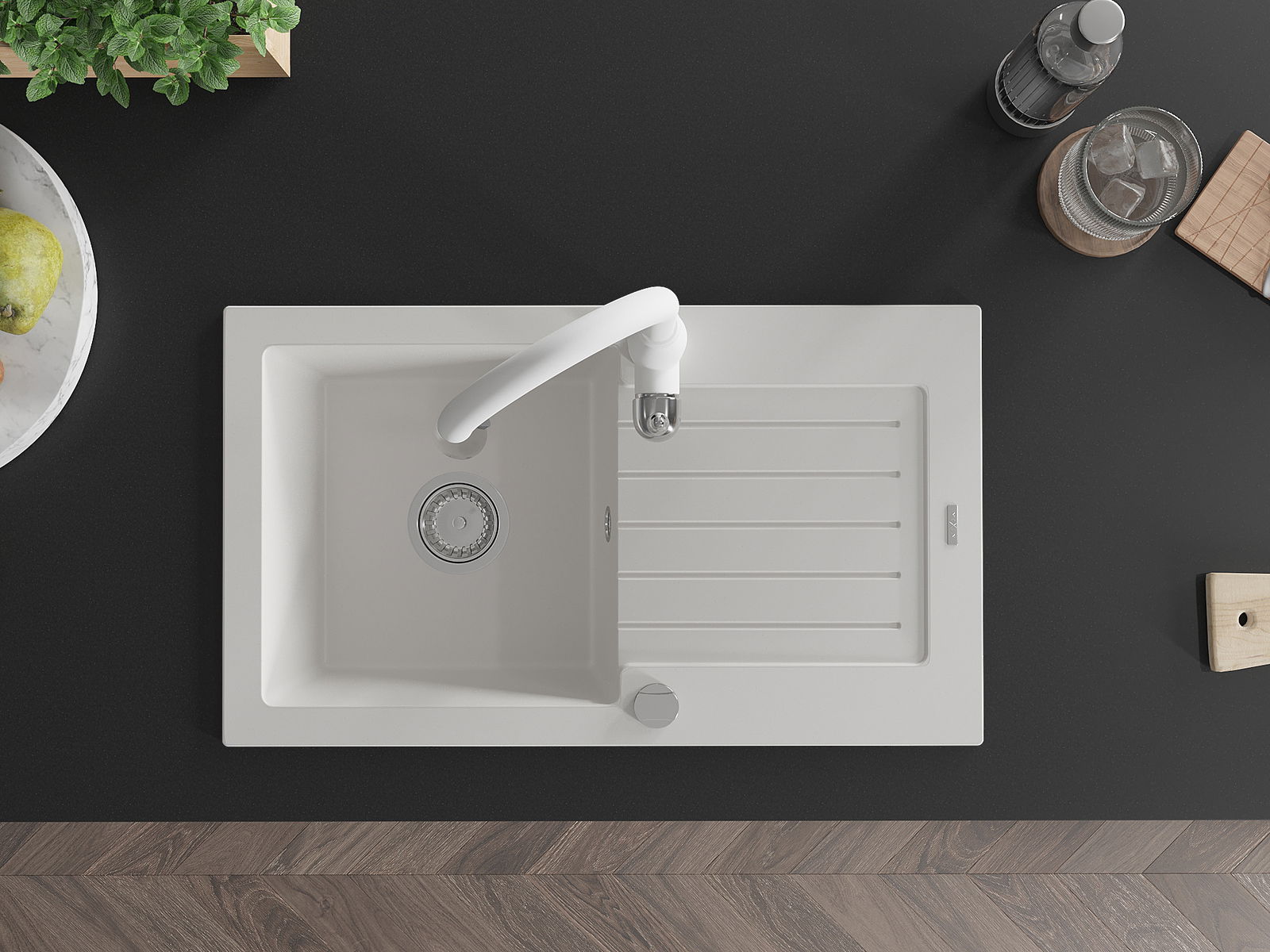 Mexen Pablo jednokomorový žulový drez s odkvapkávačom a kuchynskou batériou Savita, biely - 6510-20-672601-20