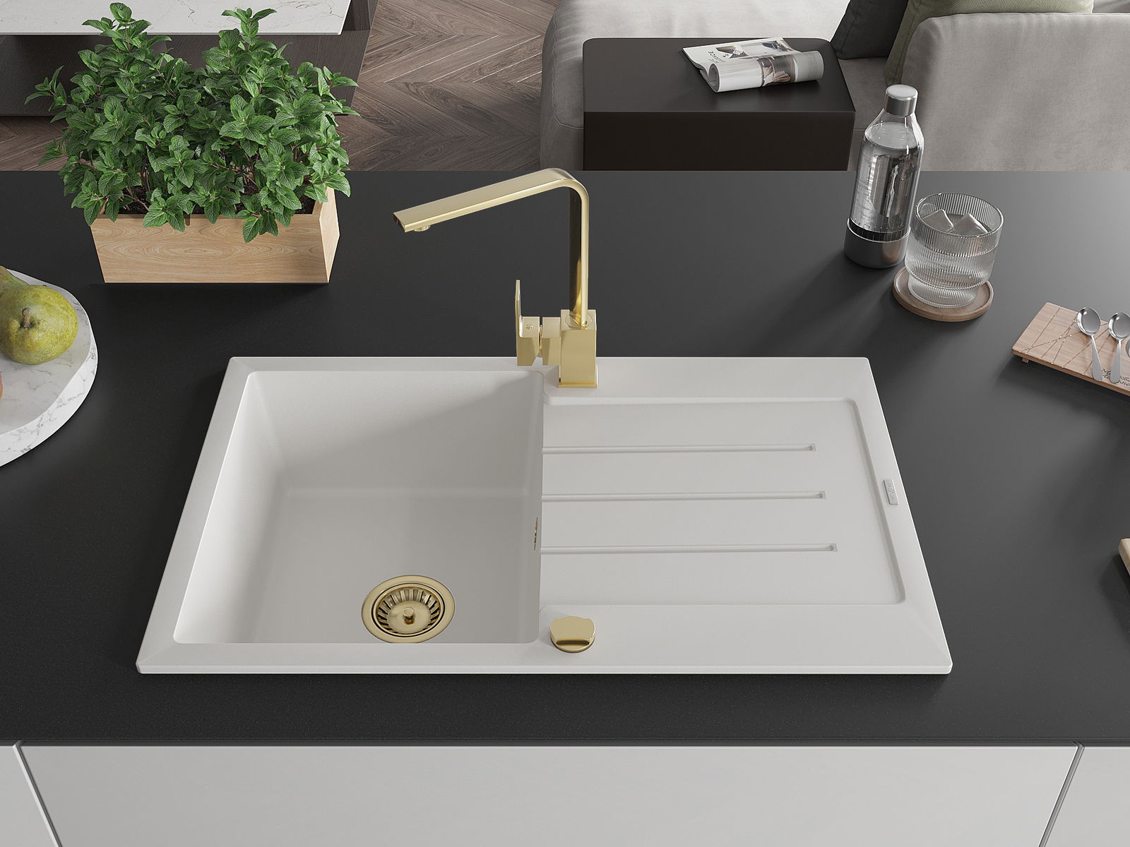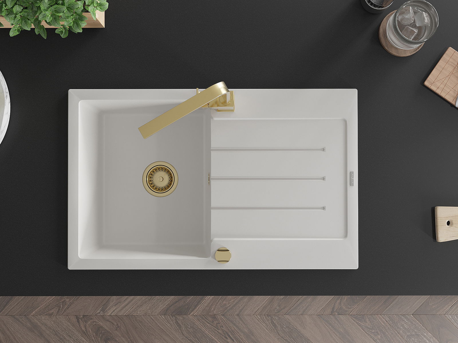 Mexen Bruno žulový drez 1-komorový s odkvapkávačom a kuchynskou batériou Rita, biela - 6513-20-670300-50
