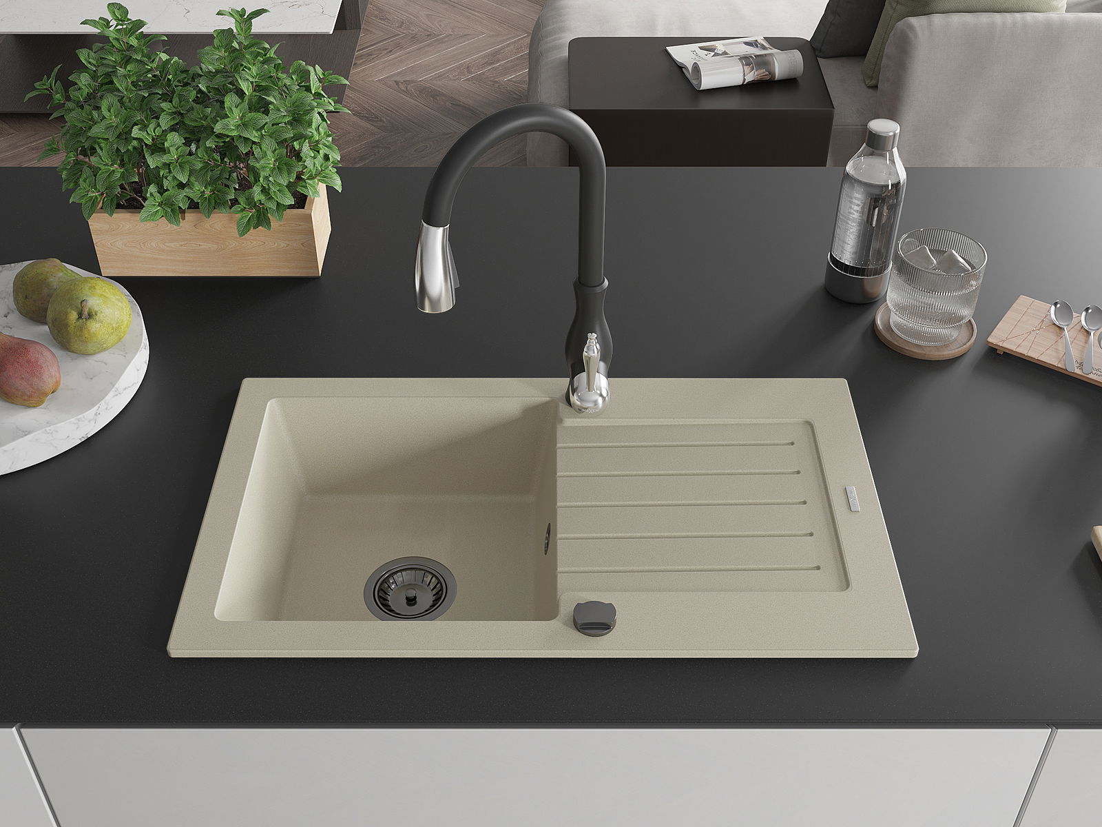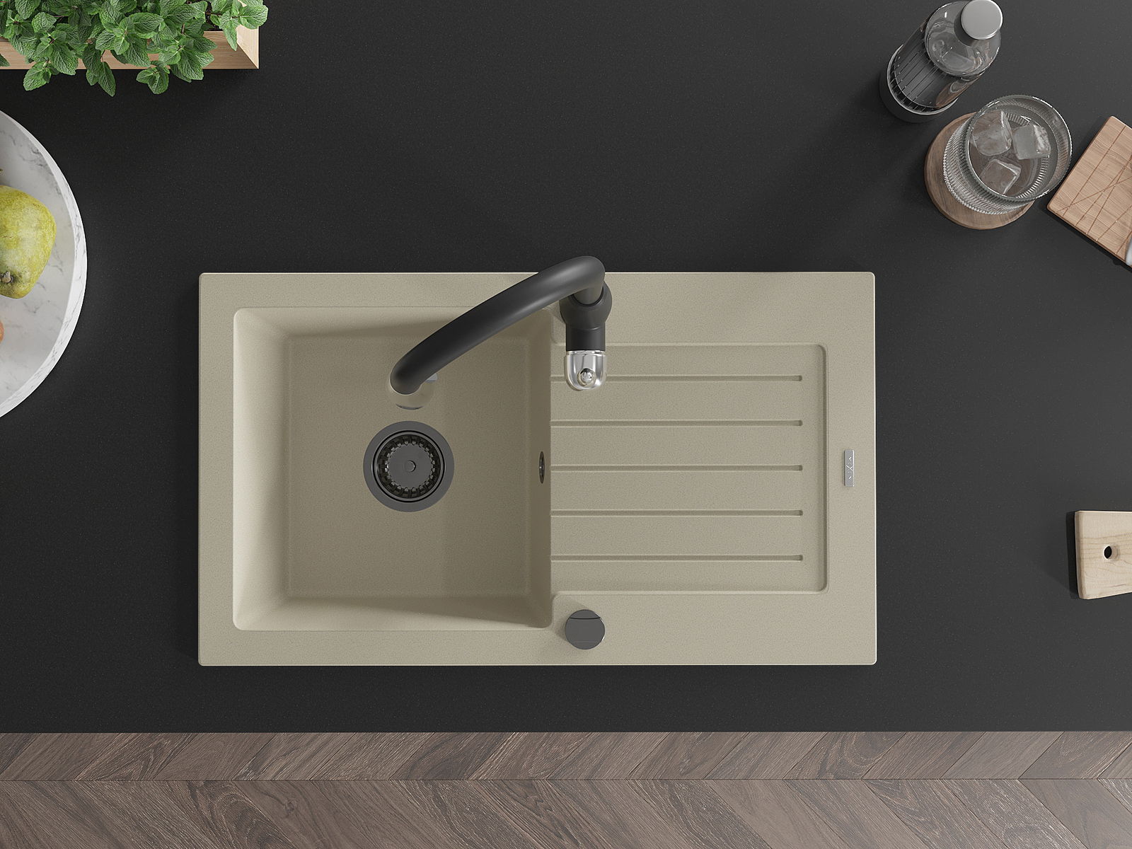 Povrch kuchynského drezu je odolný voči škvrnám a zafarbeniu, vďaka čomu sa ľahko udržiava a zachováva svoju farbu počas dlhého obdobia používania. Estetický a praktický doplnok pre každú kuchyňu.