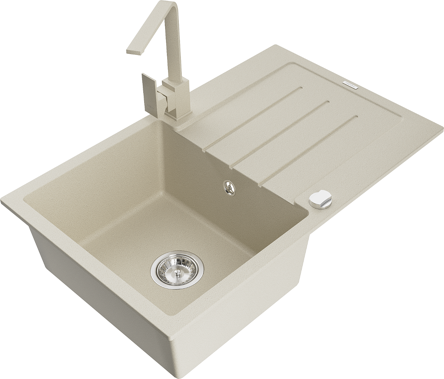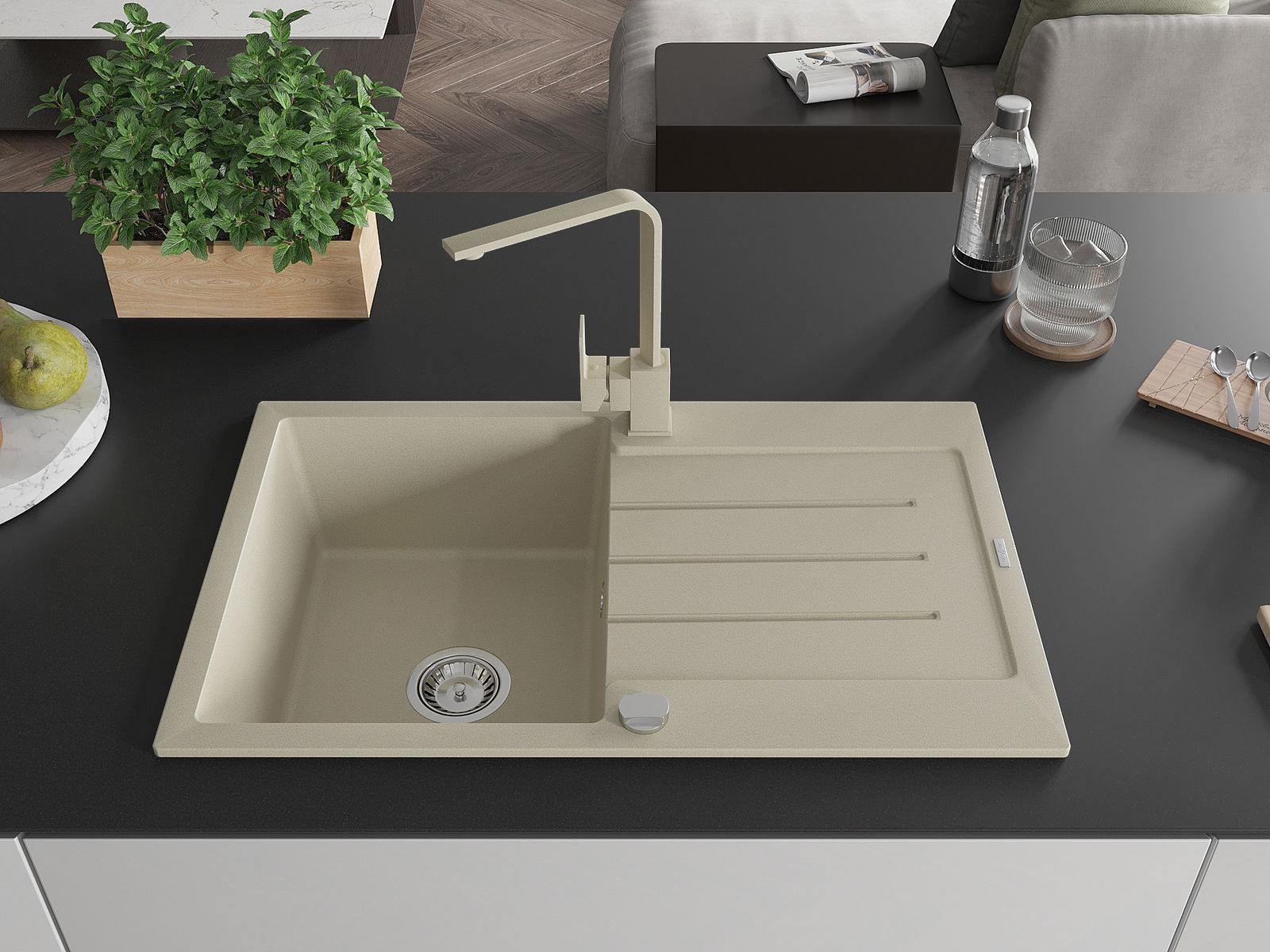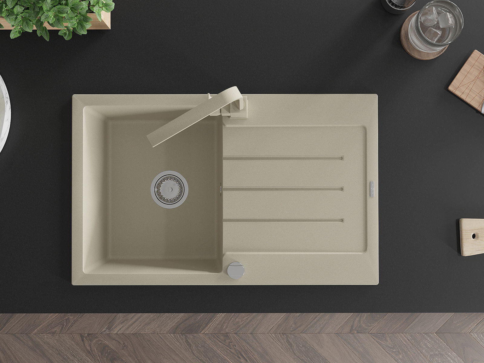 Mexen Bruno žulový kuchynský drez s 1 komorou, odkvapkávacou plochou a kuchynskou batériou Rita, béžový - 6513-69-670300-69
