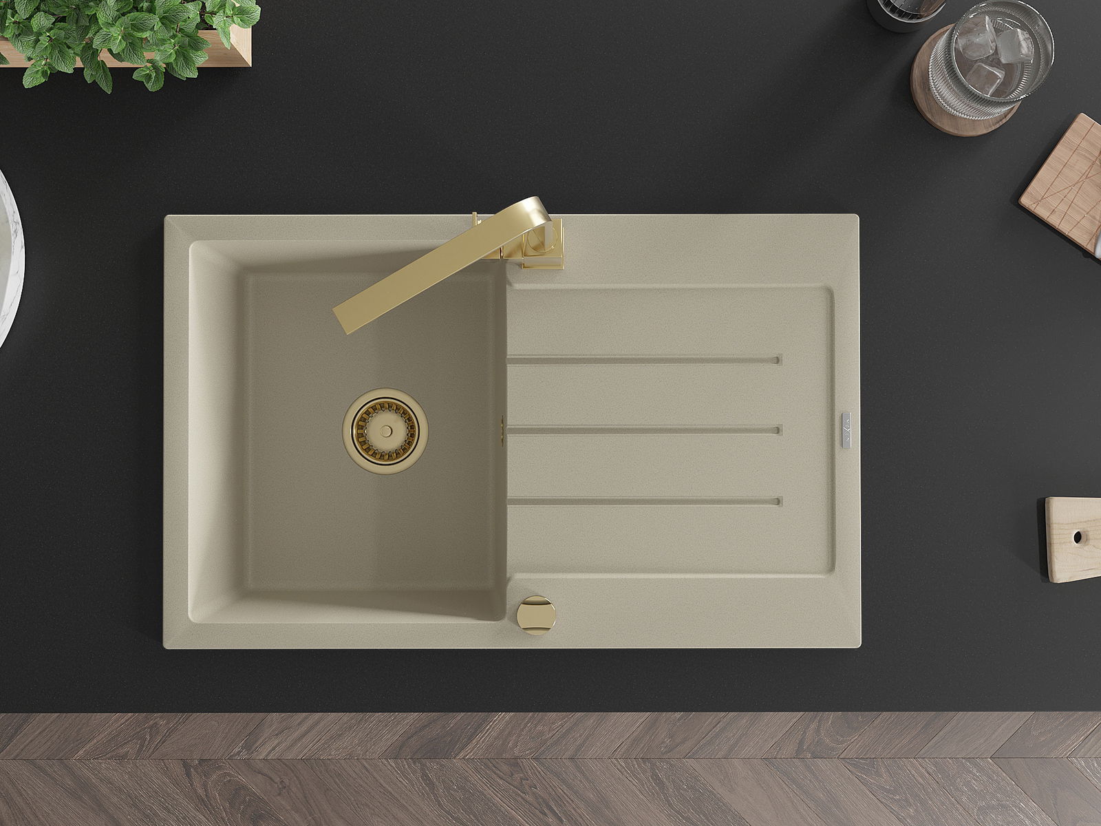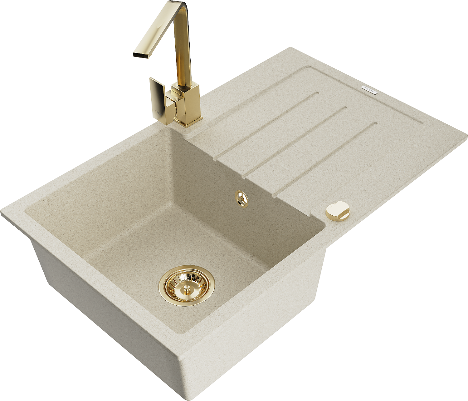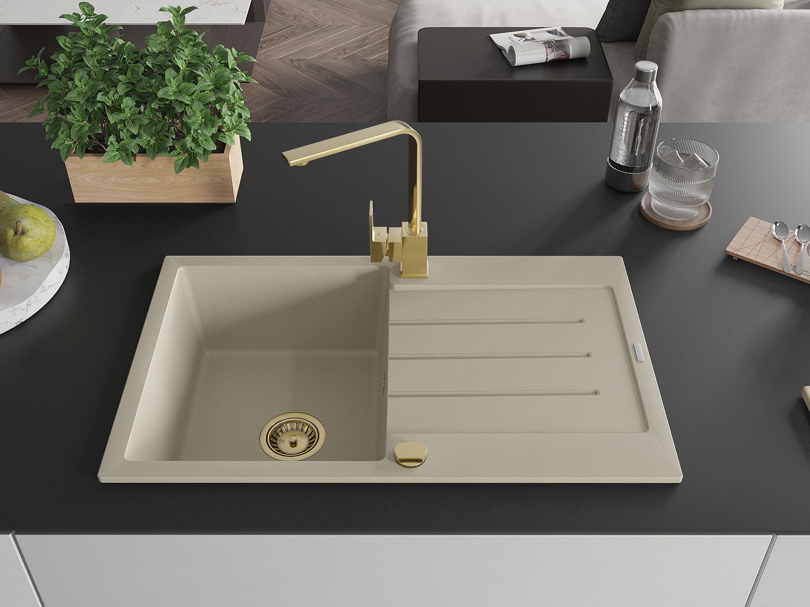 Mexen Bruno jednokomorový granitový kuchynský drez s odkvapkávačom a kuchynskou batériou Rita, béžový - 6513-69-670300-50