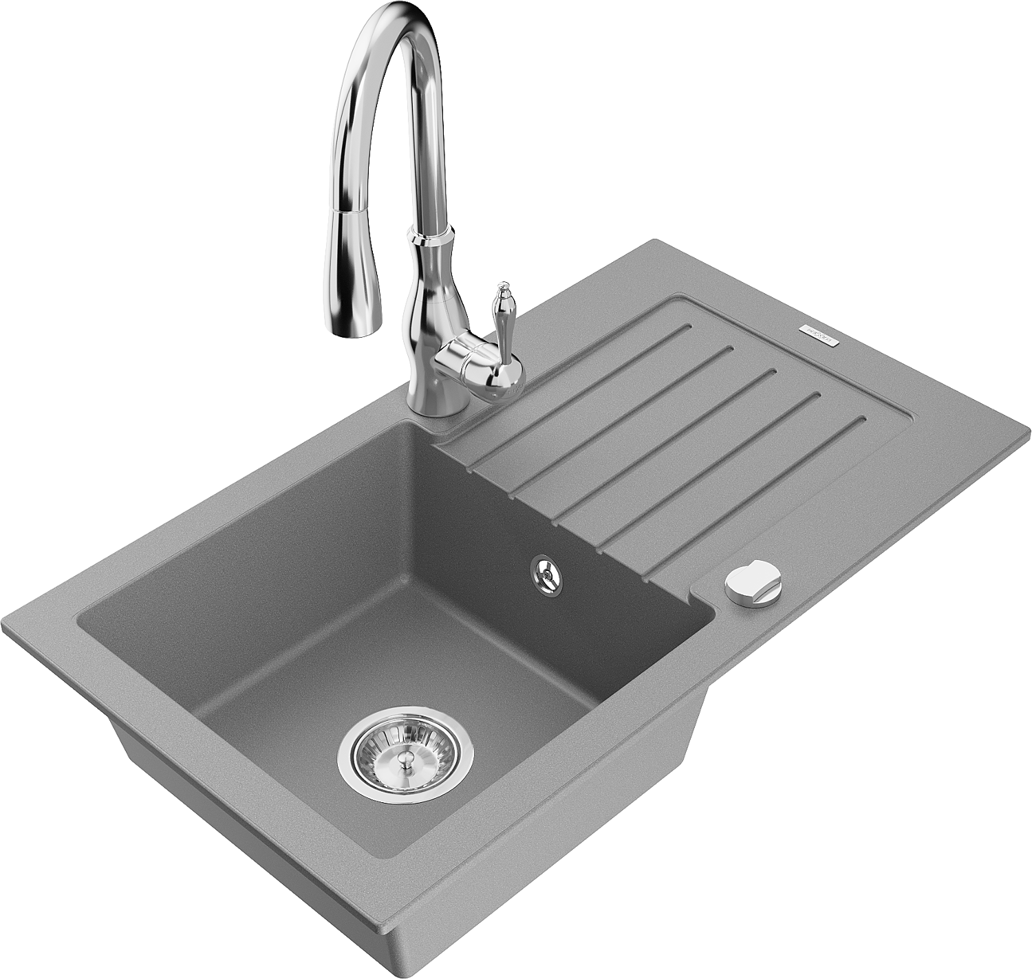 Mexen Pablo granitový kuchynský drez 1-komorový s odkvapkávacou plochou a kuchynskou batériou Savita, sivý - 6510-71-672601-00