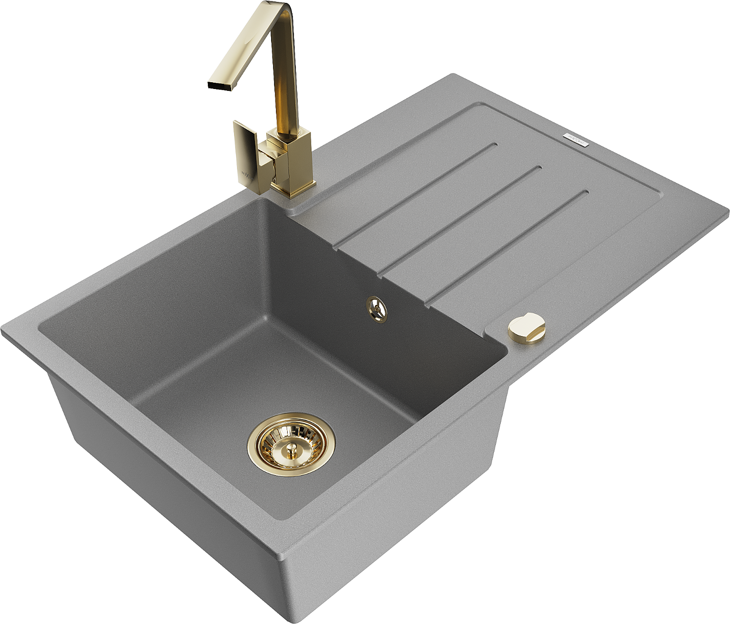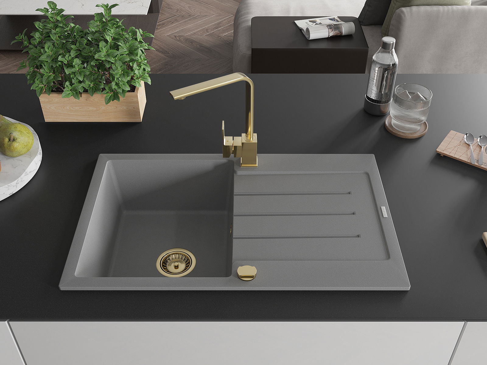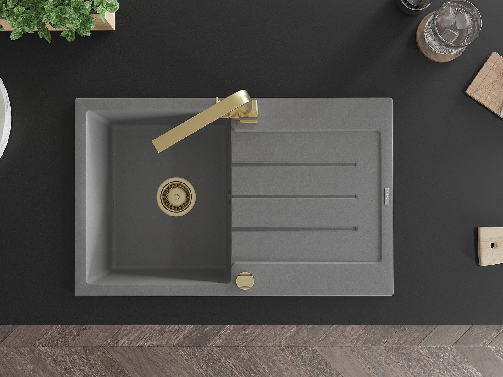 Mexen Bruno granitový kuchynský drez 1-komorový s odkvapkávačom a kuchynskou batériou Rita, sivý - 6513-71-670300-50